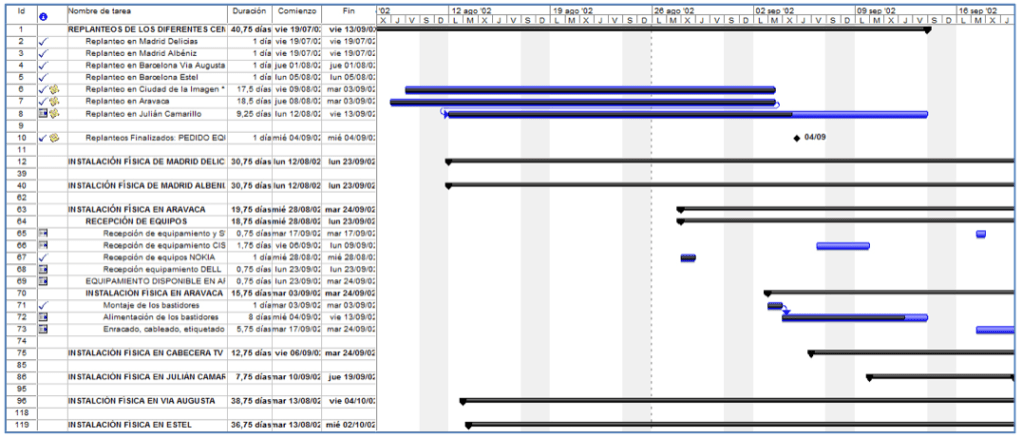 La Identificación clara y biunívoca de todas las tareas o actividades necesarias y sus responsables asignados para su ejecución y puesta en servicio ya es una garantía de éxito: empresas suministradoras, empresas instaladoras, grupos dentro de la organización de Telefónica al que se le asigna una determinada tarea (o tareas), vinculación de todas las tareas que intervienen, holgura entre tareas y/o proyecto en su conjunto, tareas con vinculación en serie o vinculación en paralelo. Con la descripción completa del proyecto, se visualizan aquellas tareas que permiten desplazamiento temporal (holgura) y cuáles no.