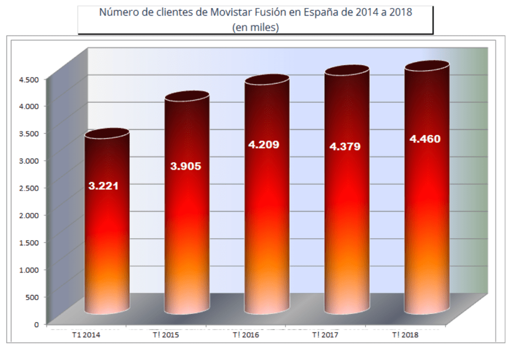 En la actualidad, Movistar + (“ayer” Imagenio) dispone de una cartera de clientes muy importante con una oferta en contenidops bajo demanda notable: Series, Documentales, Películas, 119 canales de TV, además de una serie de servicios complementarios, que por citar alguno, dispone de distintas modalidades del servicio Fusión y una nube de almacenamiento ilimitado con velocidades de subida y bajada, para sus servicios, de 1 Gbps.