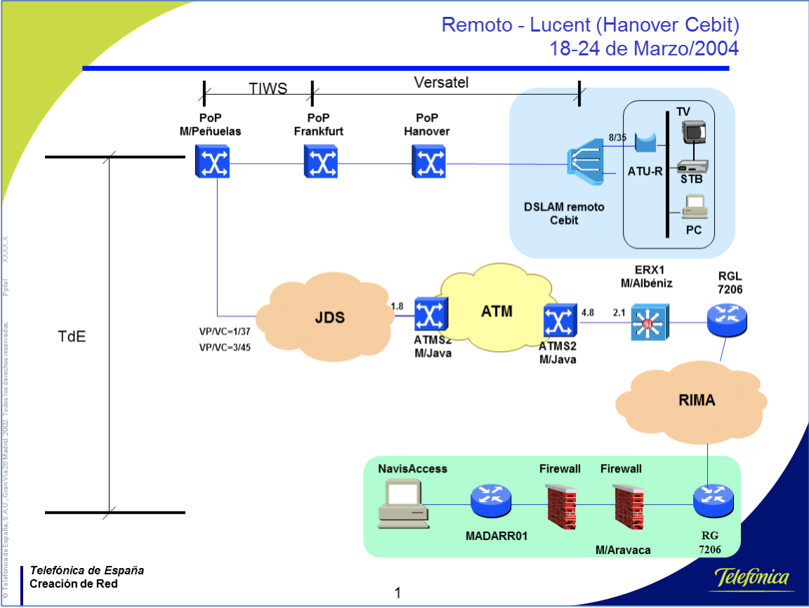 • Pruebas del servicio en Cebit: Tráfico de Cliente. Las pruebas finales en el stand del Cebit se llevaron a cabo el 16/3/2004 y consistieron en probar el tráfico de gestión (128Kbps) y el de Cliente (6.015Kbps).