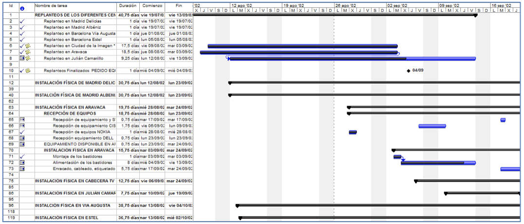 Las primeras tareas empezaron con los replanteos el 19 de Julio de 2002 en las siguientes centrales: Madrid/Delicias, Madrid/Albéniz, Barcelona/Via Augusta, Barcelona/Estel, Ciudad de la Imagen, Aravaca, Julián Camarillo…