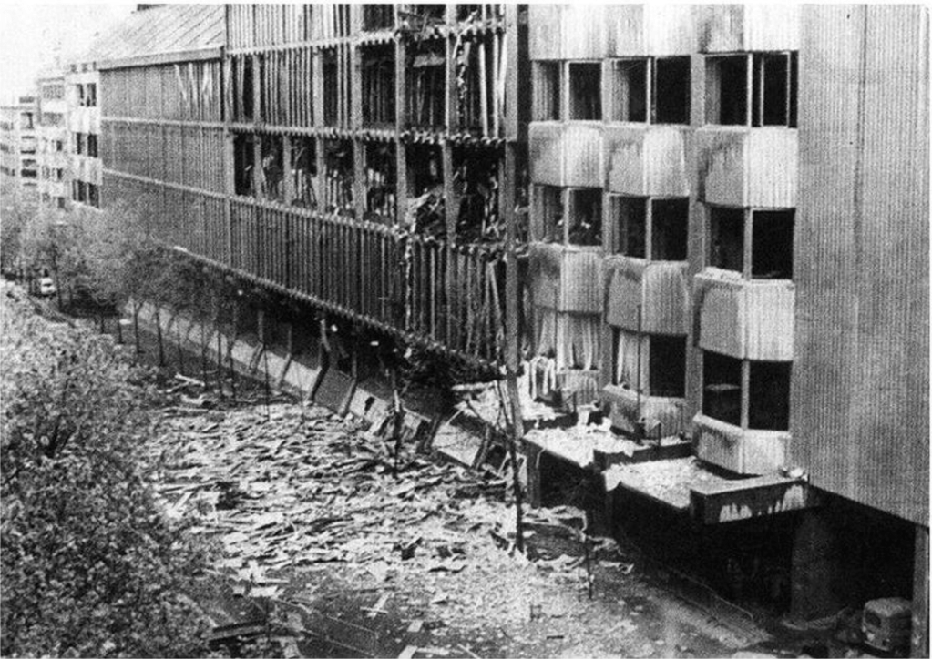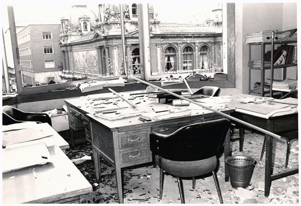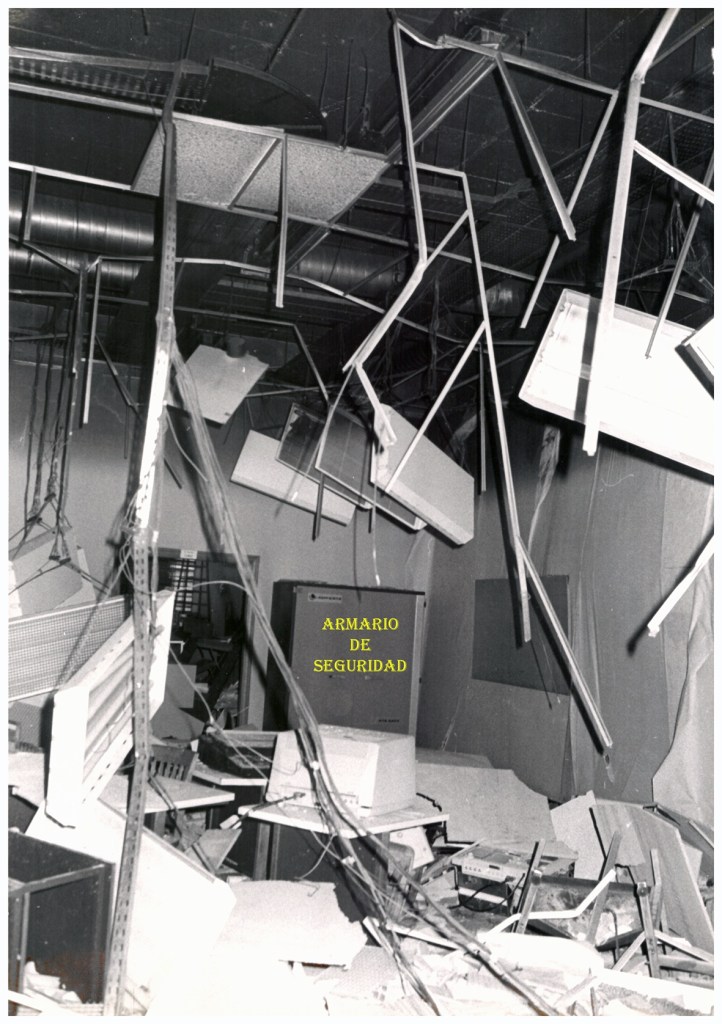 Me puse en camino cuanto antes y me encontré el mayor desastre en infraestructuras de comunicaciones que nunca pude imaginar. A pesar de los controles, por mi trabajo allí, me dejaron entrar y contactar con mis superiores a la vez que patear algo sobre los escombros y chatarra en que había quedado todo, en especial en nuestra planta 3ª. Equipos de ordenadores con servicios de CCR y C de la marca Honeywell Bull y el SPCM soportado en un ordenador UNIVAC 1160, todos destrozados, los falsos suelos reventados y los falsos techos prácticamente desaparecidos, provocado todo ello por la deflagración de dos bombas de gran tamaño colocadas en el falso suelo de la planta.