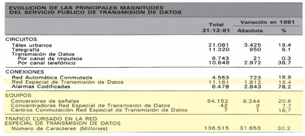 En el proyecto, que responde en un primer momento a la denominación de Red Especial de Datos (RETD) y más tarde Red IBERPAC, se integran, en un esfuerzo común, las entidades a las cuales beneficiaría la red, los bancos encabezados por Banesto, las industrias del ramo de las telecomunicaciones: Secoinsa, Sytre, Amper y Telefónica con la creación de la División de Informática. Cuando se define la escuela ideal, siempre se habla de que en ella deben integrarse: alumnos, profesores, familia y Estado. Se puede asegurar que en el desarrollo de la red IBERPAC también se dieron las condiciones ideales de amplia participación para conseguir garantizar el éxito que realmente se produjo. Las cifras asociadas al informe anual de Telefónica de 1981 muestran el enorme crecimiento experimentado referido a la planta instalada de la RETD, número de circuitos conectados y tráfico cursado. En el siguiente cuadro se pueden ver los valores alcanzados: