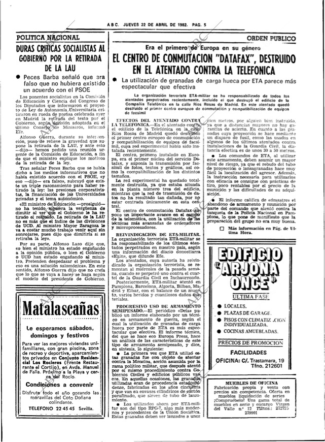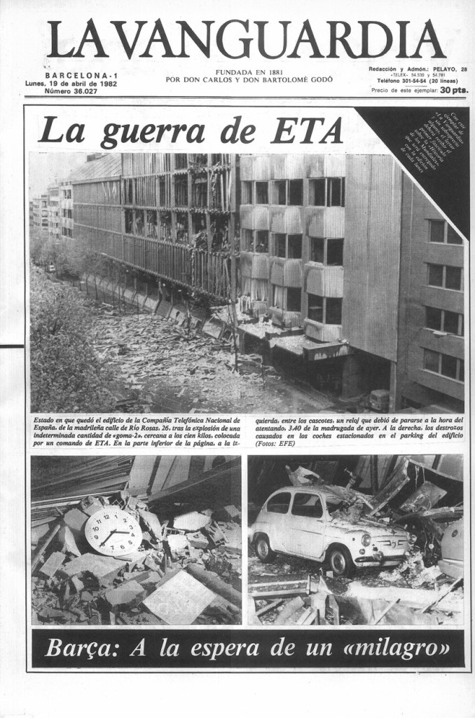 En la mañana del domingo 18-4-82, me encontraba desayunando con mi mujer, como de costumbre los fines de semana, con la radio puesta, cuando de inmediato escuchamos la noticia del terrible atentado en la central telefónica de Ríos Rosas, donde yo trabajaba. Llamé al instante a mi jefe Naveiras y me atendió su señora, diciéndome que ya se había ido para la central.