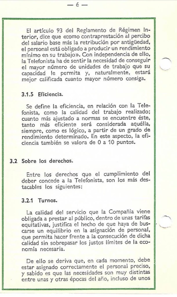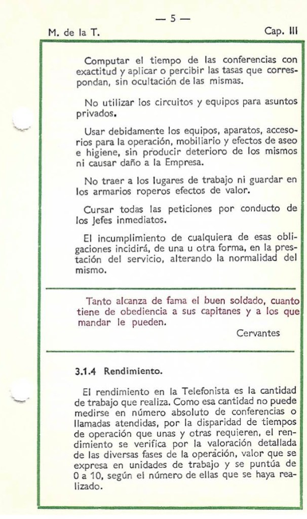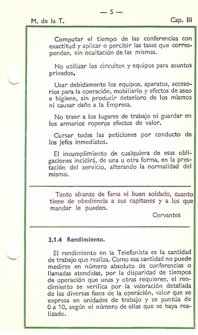 Un punto muy interesante, y cito: “El rendimiento de una Telefonista es la cantidad de trabajo que realiza. Como esa cantidad no se puede medir en número absoluto de conferencias o llamadas atendidas por la disparidad de tiempos que unas y otras requieren, el rendimiento se verifica por la valoración detallada de las diversas fases de la operación, valor que se expresa en unidades de trabajo y se puntúa de 0 a 10, según el número de ellas que se haya realizado”. Uno de los ítems que se miden hoy en día es precisamente el número de llamadas atendidas. La llamada se ha convertido en una posibilidad de venta, y la estadística da la razón, a más llamadas atendidas más ventas. La estadística se ha impuesto a la calidad (que también es un ítem que se puede medir, pero no siempre).