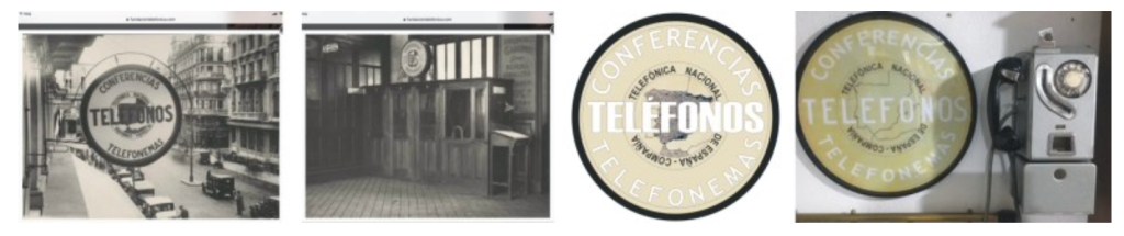 Uno de los primeros rótulos, de los que se tiene constancia fotográfica, y que, en la Revista Telefónica Española, de abril de 1926, no se describen, (acaso porque pudieran ser anteriores a esa fecha) son unos carteles a doble cara, con el mapa de España, y en cuya parte superior pone Conferencias, en su parte central Teléfonos, y en la inferior: Telefonemas. En fotografías del Archivo Histórico de la Fundación Telefónica, se encuentran en la puerta de entrada de los locutorios, o ya en el interior, sobre las cabinas. Aparentemente pudieran llevar en su interior bombillas para su iluminación. Podemos observar que las hay, al menos en dos terminaciones: una en tonos claros, y otra en tonos más oscuros, pero no disponer de fotografía en color, nos resulta difícil discernir los colores exactos.