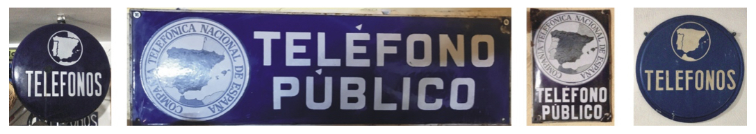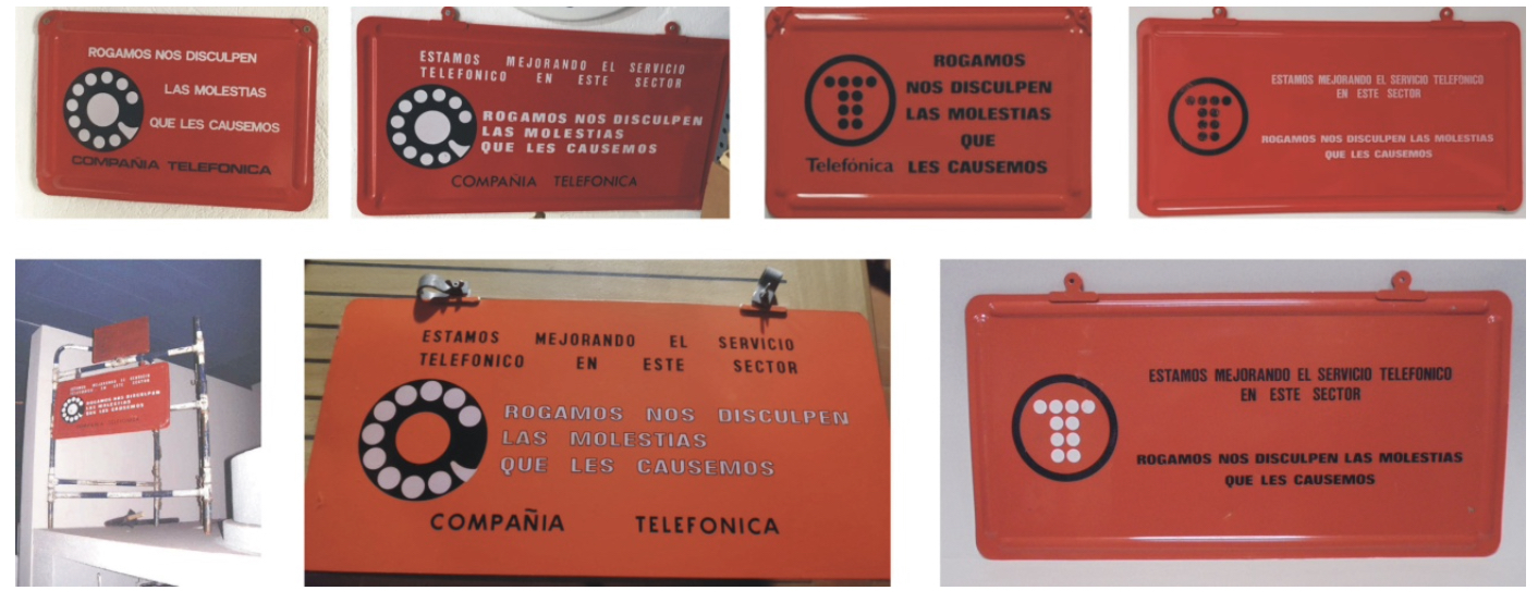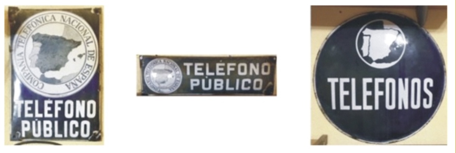 También, de esa época, se han identificado otros dos tipos de carteles, en chapa más pequeños, situados en la puerta de los locutorios o de las centrales atendidas. Uno de ellos de pared, redondo con el mapa de España y otro para colgar, sin palabras, representados un teléfono de sobremesa.