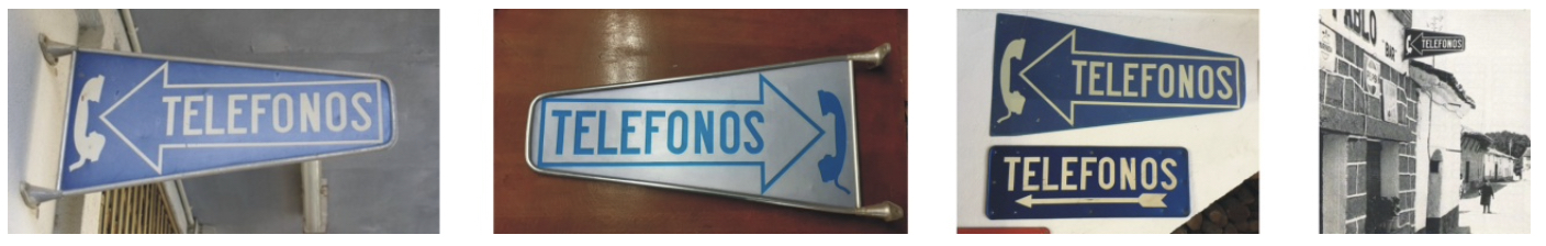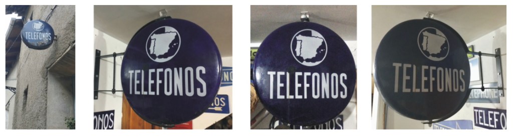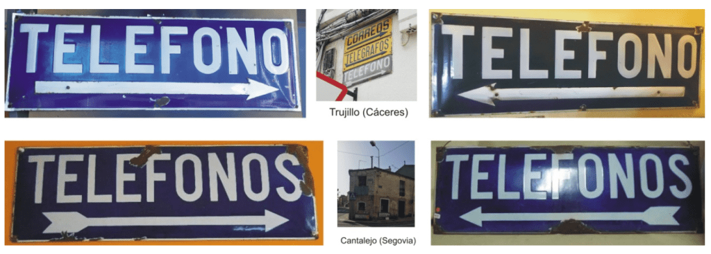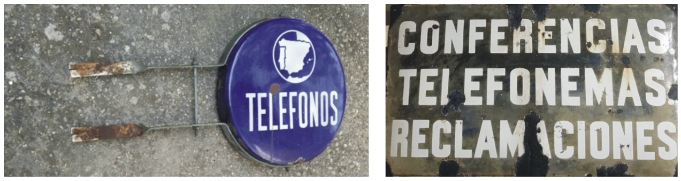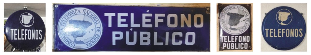 También de esa época hay otro cartel algo más grande, rectangular, azul marino, en hierro esmaltado que pone “TELÉFONO” y con una flecha indicadora superpuesta y fijada por dos pequeños remaches o tornillos, que se podía “girar” para cambiarla de dirección.