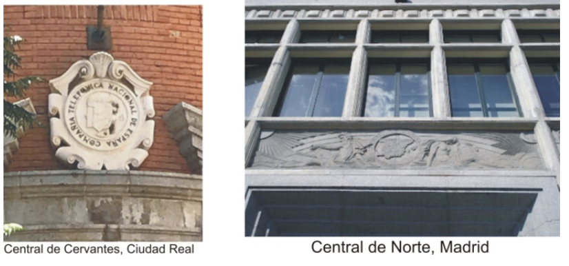 En centrales, como estas, Cervantes (en Ciudad Real), y Norte (en la calle Raimundo Fernández Villaverde, Madrid), podemos observar los escudos CTNE, grabados en piedra. La central de Norte, inaugurada en 1949, es considerada una obra maestra en arquitectura comercial del arquitecto José María de la Vega. Se la definió como: “magnífico edificio, en el que destacan los elegantes relieves alegóricos sobre comunicaciones en torno a la puerta”.