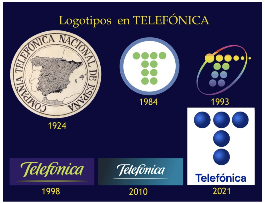 Con el paso de los años, la imagen corporativa de TELEFÓNICA, ha ido evolucionando y cambiando su logotipo como se recoge en el cuadro adjunto, siendo el último el realizado en el año 2021,