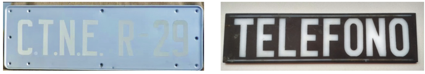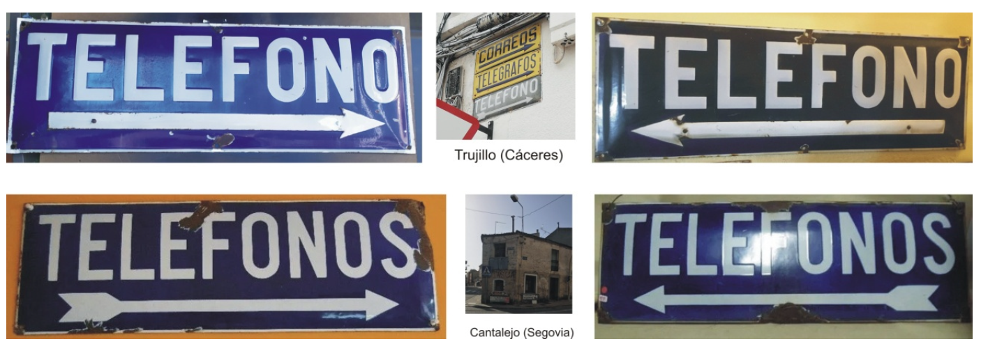 Estos carteles esmaltados con el paso del tiempo y las inclemencias climatológicas, se fueron deteriorando, sobre todo debido a la oxidación, principalmente en los bordes. Por esto, pero también debido a los juegos infantiles de la época (eran la diana perfecta para practicar con el tirachinas, piedras, y las escopetas de perdigones…), se fueron sustituyendo por otros fabricados en materiales más ligeros y baratos, como el aluminio. De este material, con letras reflectantes, encontramos los dos modelos de carteles rectangulares de «TELEFONOS», con la flecha de indicación en las dos direcciones y otro más grande, en forma de trapecio y con el dibujo de un microteléfono, para colocar en la pared.