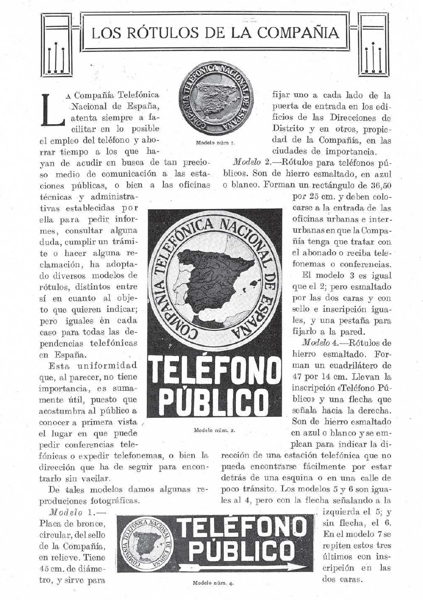 Sin embargo, como veremos más adelante, estos no son los primitivos rótulos de CTNE, sino aquellos cuya realidad muestran fotos del Archivo Histórico de la Fundación Telefónica que parecen ser realmente los primeros rótulos de la naciente CTNE, de 1924, que luego fueron sustituidos, como parece, por los anteriormente mencionados, rótulos que conservaron su permanencia como representación de la Compañía hasta 1984 cuando cambia el nombre de Compañía Telefónica Nacional de España por el de Telefónica.