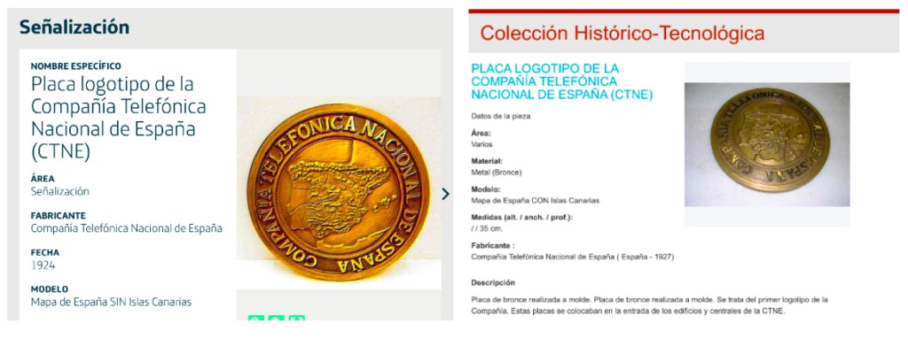 Estas placas en bronce, estuvieron instaladas hasta principio de la década de los años 80’ del siglo pasado, hasta el cambio de logotipo y nombre. Fue en 1984 el cambio importante de imagen y del nuevo nombre: Telefónica.