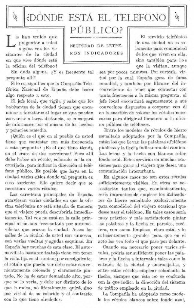 En esta búsqueda imaginativa repasando los índices de la Revista Telefónica de España disponibles en esta misma web, caen mis ojos en dos artículos, uno de abril y otro de junio, del volumen del año 1926, que son clave para conocer los primeros pasos de la recién creada CTNE en la publicidad de sus centros de servicio telefónico público.