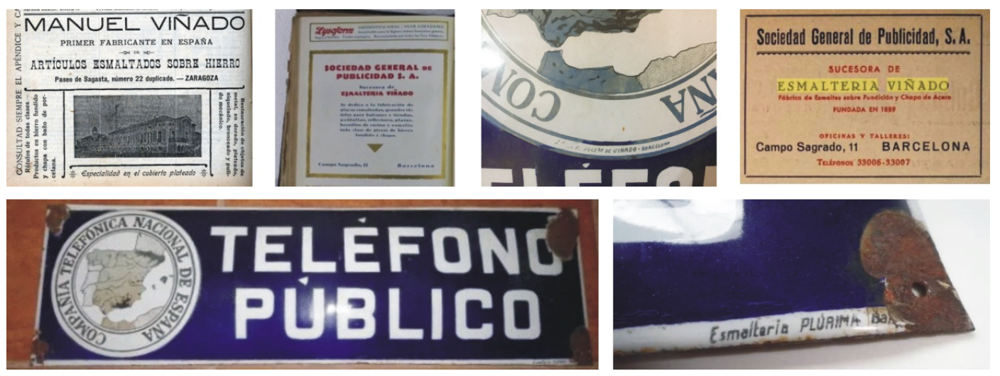 Las placas esmaltadas que conocemos (porque por suerte aún se encuentran en algunas de nuestras calles), fueron las fabricadas, en hierro esmaltado, por la empresa Sociedad General de Publicidad S.A., sucesora de Esmaltería Viñado, situada en la calle Campo Sagrado, 11, de Barcelona, familiares o descendientes de Manuel Viñado que, en 1889, en Zaragoza, fundó la primera empresa en España dedicada a la rotulación en hierro esmaltado. También hemos encontrado una placa esmaltada alargada rectangular, de señalización de Teléfono Público, que fue fabricada por la empresa Esmaltería Plúrima, en Barcelona.