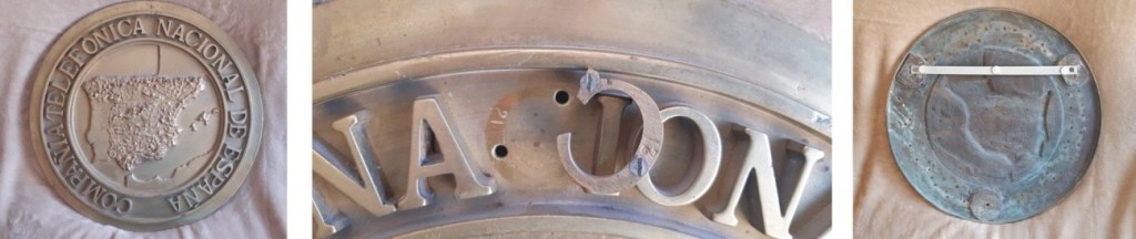 Como curiosidad, el compañero Marcos Vergara, nos muestra una placa de bronce, pero que tiene una curiosidad que hasta ahora no habíamos visto. Esta tiene las letras sueltas (no como en el resto que están unidas a la placa) de Compañía Telefónica Nacional de España, sujetas a la placa por dos tornillos cada una de dichas letras. Están van numeradas, para facilitar su colocación.