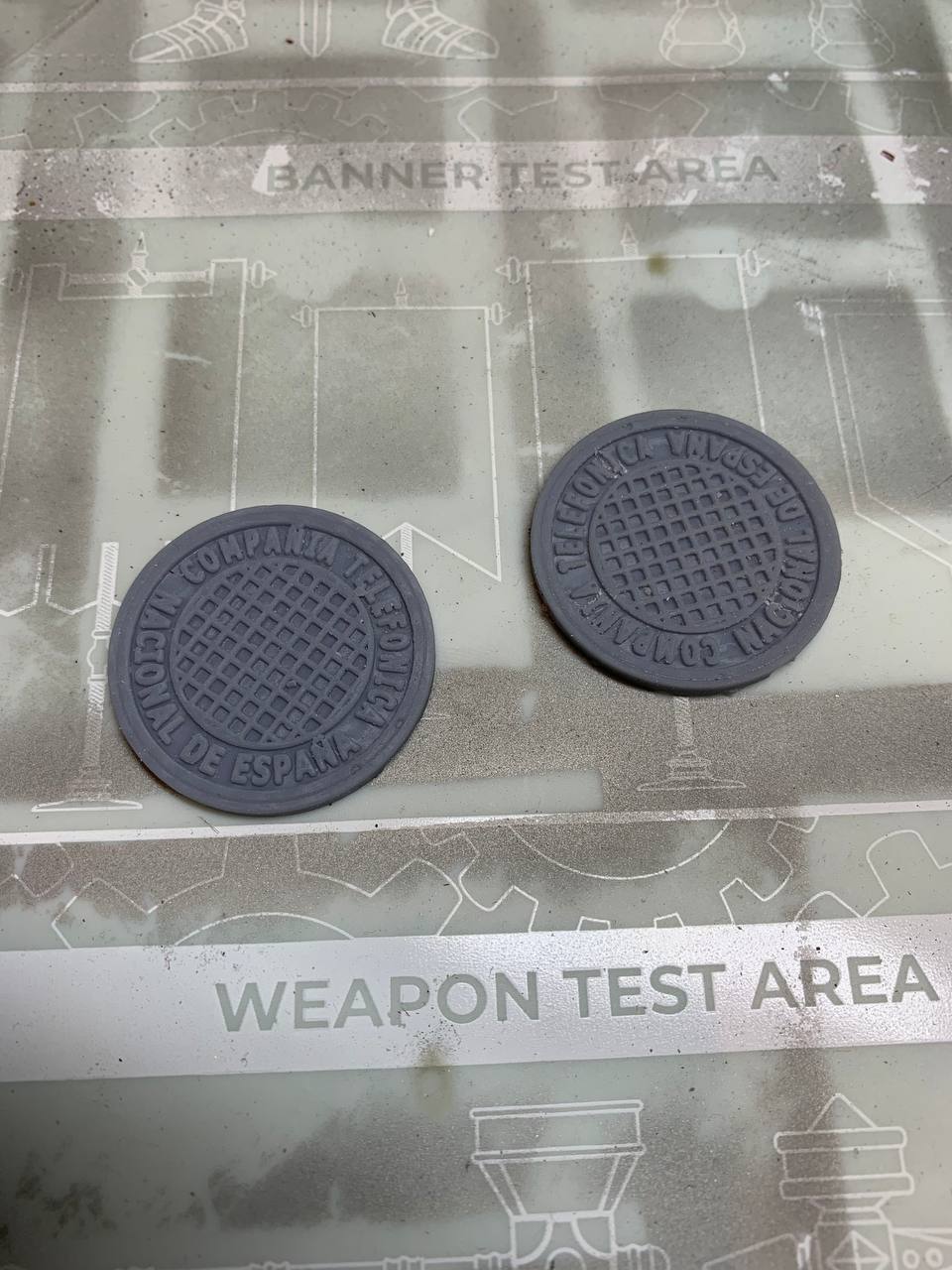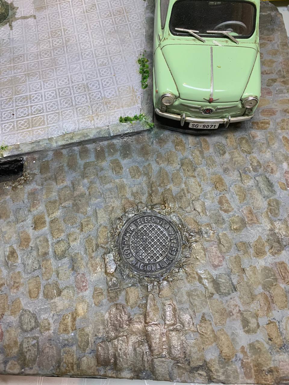 La tapa ha sido diseñada siguiendo fotos de la original de nuevo por Miguel Ángel de la Calle e impresa esta vez en resina para detallarla lo mejor posible. Se ha pintado de base con color negro óxido y luego se ha dado pincel seco con color “gun metal” y titanium. Con estos dos últimos colores se consigue el efecto de desgastado.