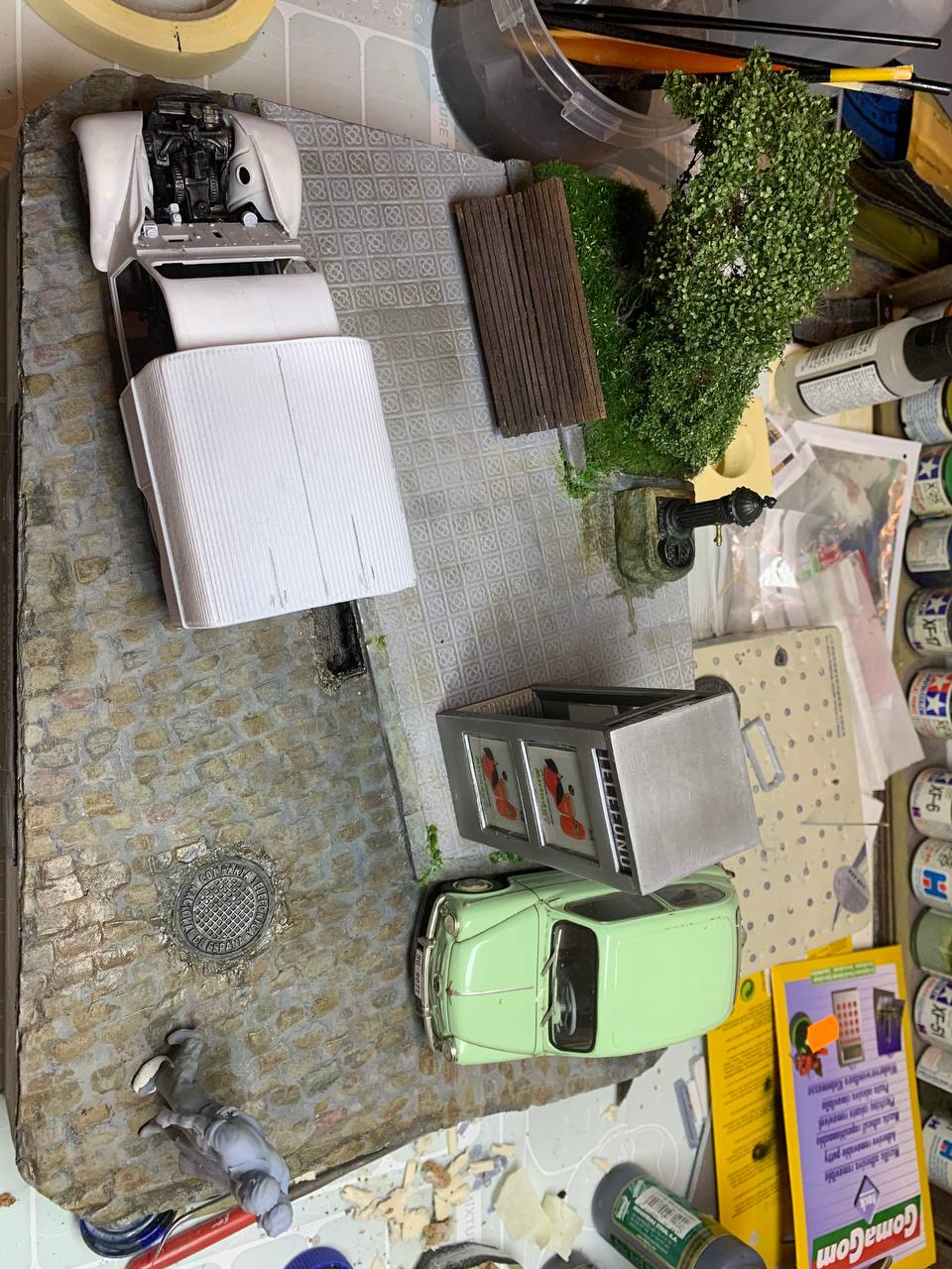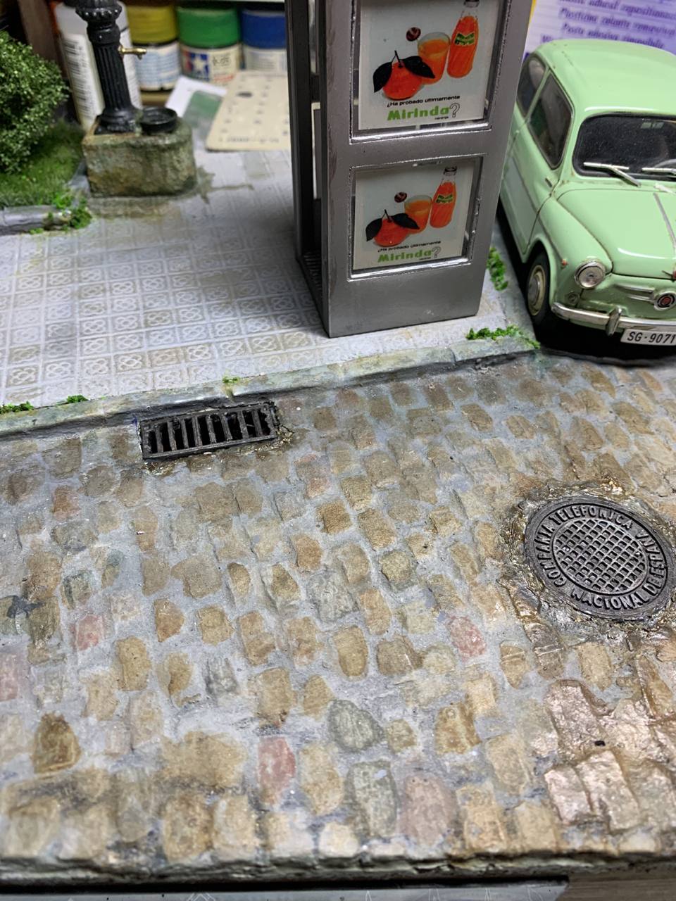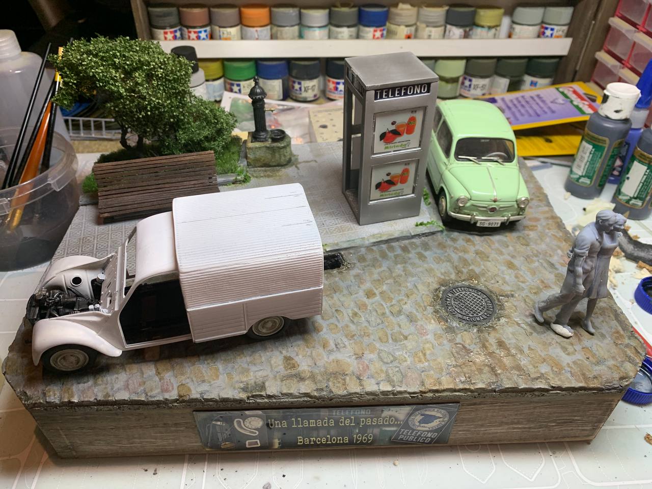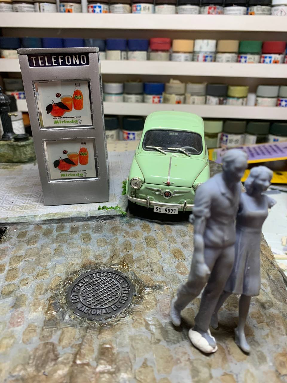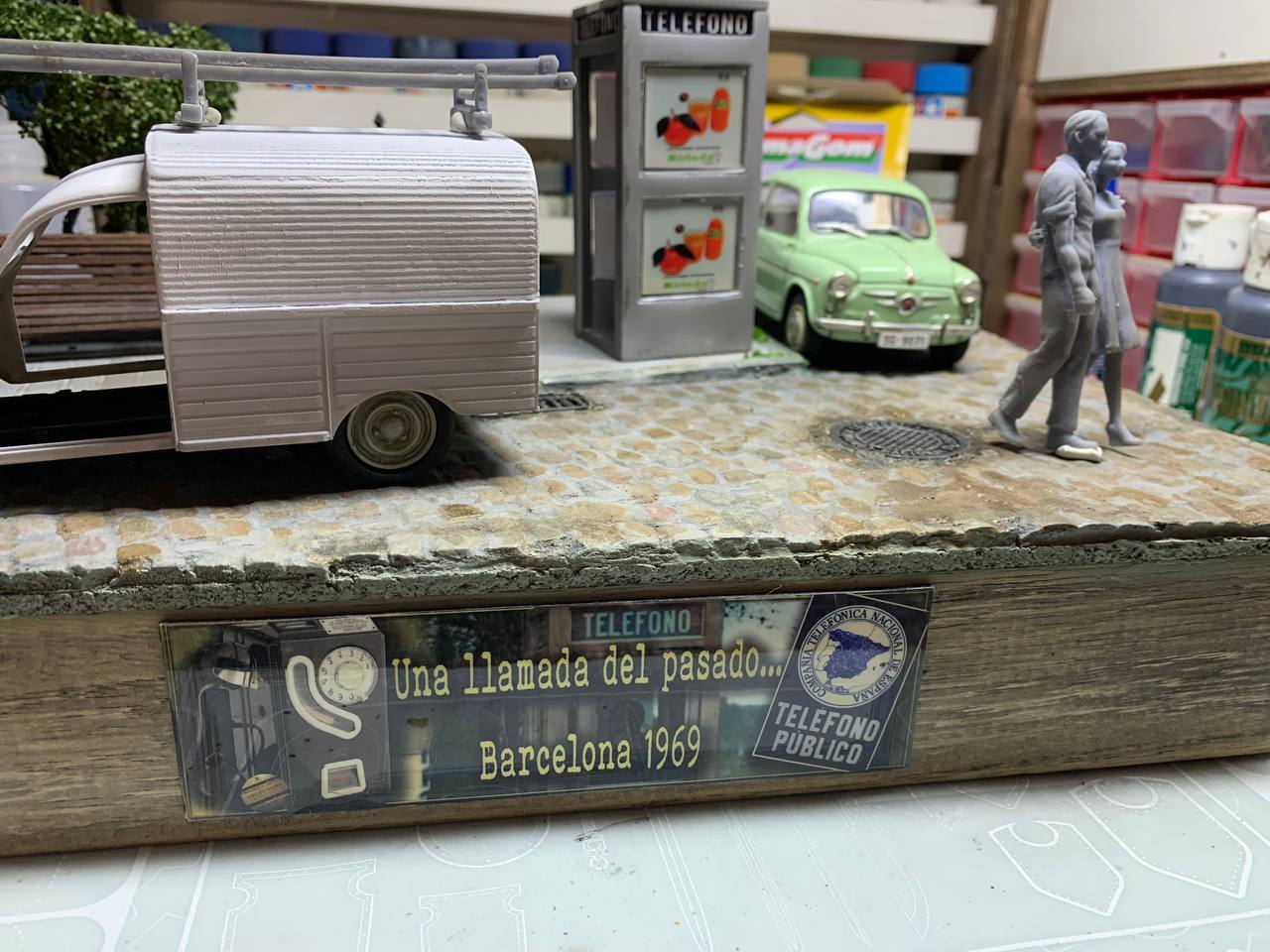 Los detalles en una viñeta o diorama (*) es lo que realza esa escena y no tenía que faltar en ella una guía de la época que, cómo es sabido, inicialmente formaba parte del equipamiento de las primeras cabinas urbanas.