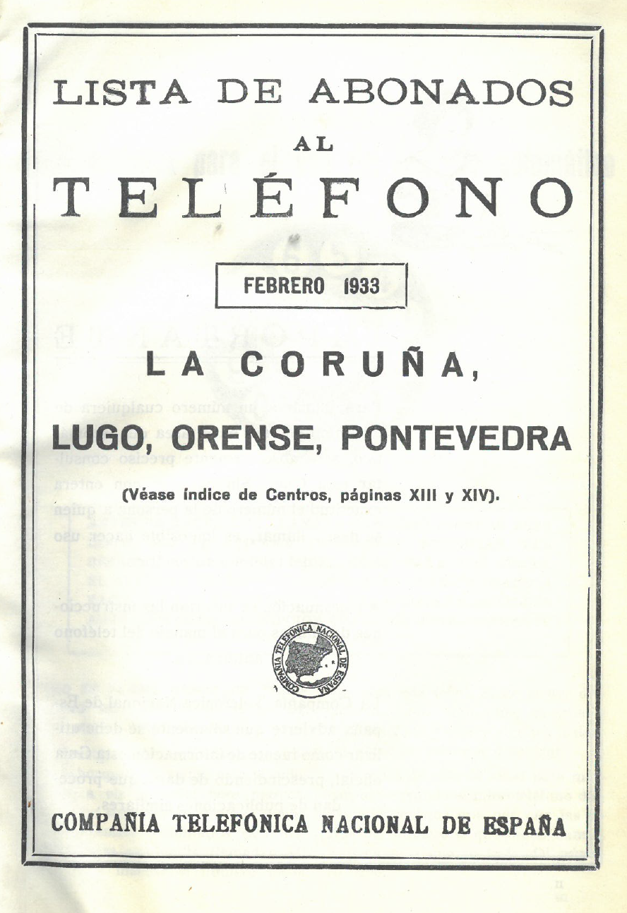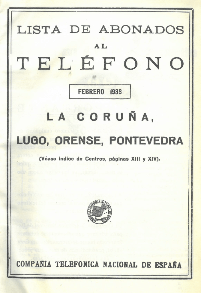 Lista de abonados al Teléfono de La Coruña, Lugo, Orense, Pontevedra. Febrero 1933. Compañía Telefónica Nacional de España. Estupendo ejemplar que podemos hojear por cortesía de Iago Soto Mata, estudioso de la historia de la telefonía en Galicia y seguidor de este blog a quien agradecemos su desinteresada colaboración. La guía consta de 71 páginas con el listado de abonados de todas las poblaciones gallegas (aunque faltan la páginas correspondientes a la Sección de Profesiones), precedido de las muy interesantes instrucciones para el manejo del teléfono automático y el manual. Podemos verla y descargarla pinchando aquí Guía Teléfonos Galicia 1933.