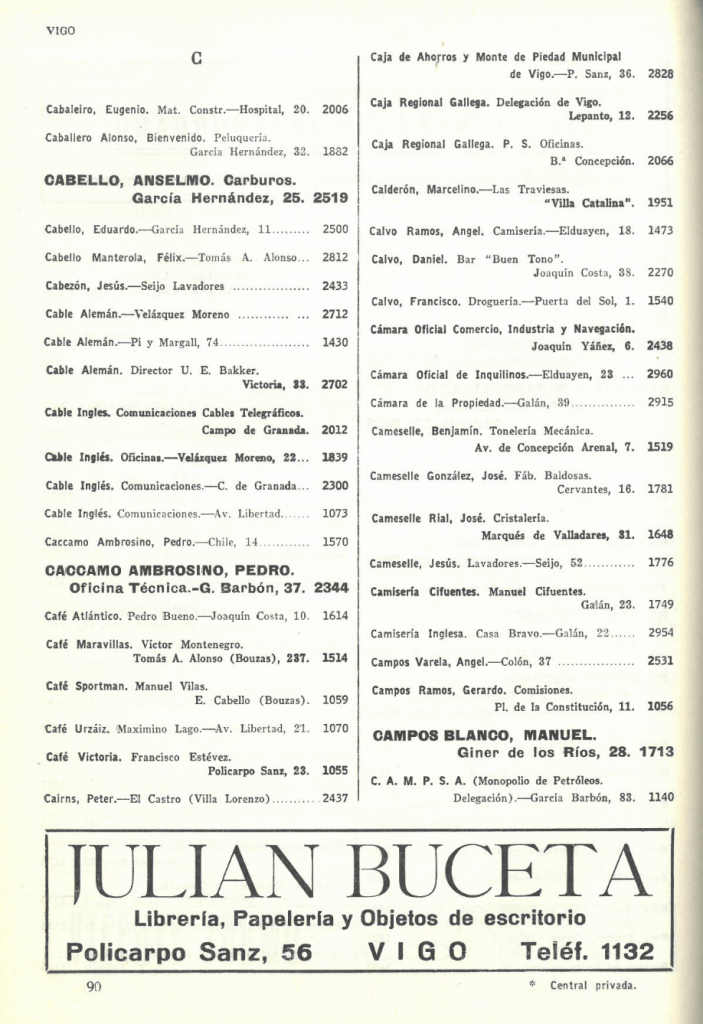 Por el momento, de lo que hablarémos en una futura entrada, queremos destacar ahora el que entre la relación de abonados de Vigo había varios teléfonos asignados al «Cable alemán» y al «Cable inglés» que eran cables telegráficos submarinos, todavía en servicio, de otras compañías que anclaban en