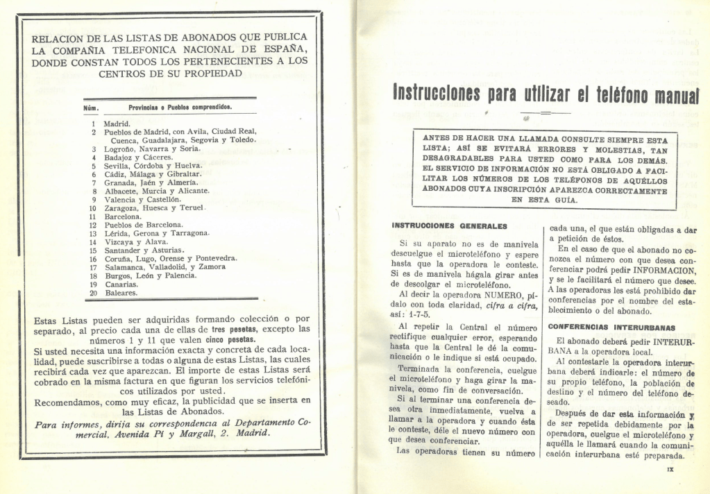 En estas dos páginas se da la interesante noticia de todas las listas que, por entonces, publicaba ya la CTNE; cada una de ellas se podía adquirir por «sólo tres pesetas» excepto las de Madrid y Barcelona que costaban cinco. En la siguiente se inician las instrucciones para el uso del teléfono manual, cuya lectura recomendamos. Tanto en el caso manual como en el automático destaca el servicio de Telefonemas que entonces aún prestaba la compañía telefónica.