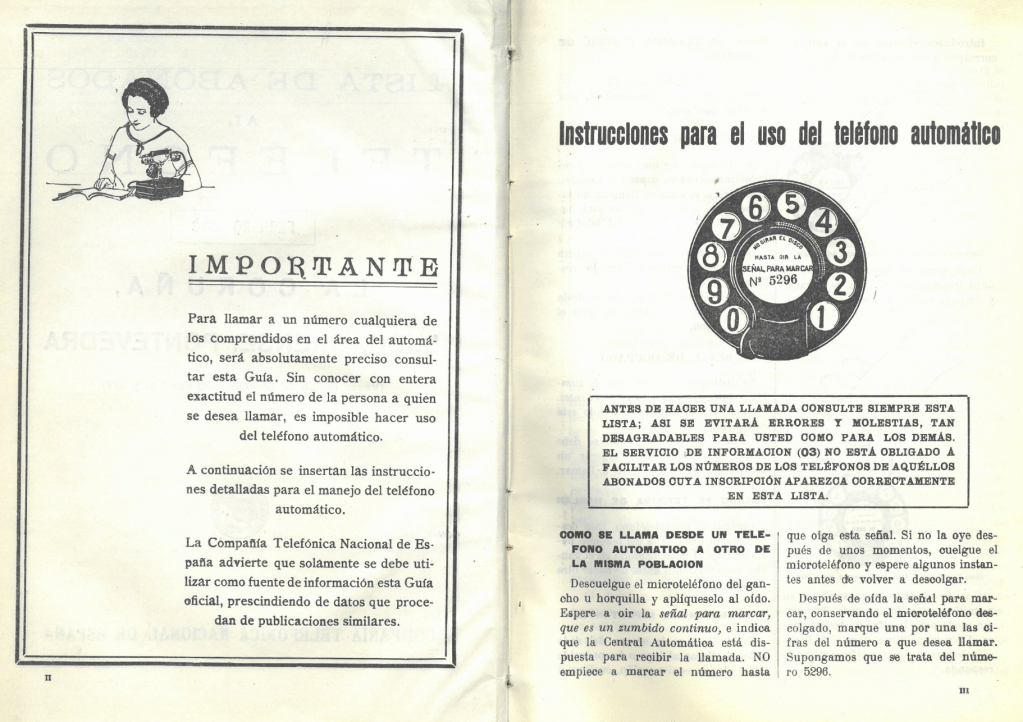 En las páginas siguientes se dan instrucciones para el uso del teléfono automático. Recordemos que en 1933 la automatización del servicio apenas se había extendido, más allá de las principales capitales de provincia , por lo que los aparatos con «disco de marcar» no eran muy conocidos y no era nada obvio su manejo. Obsérvese el disco representado, que corresponde a los primeros fabricados por Standard Eléctrica en España, replicando los modelos de la Bell de Amberes.