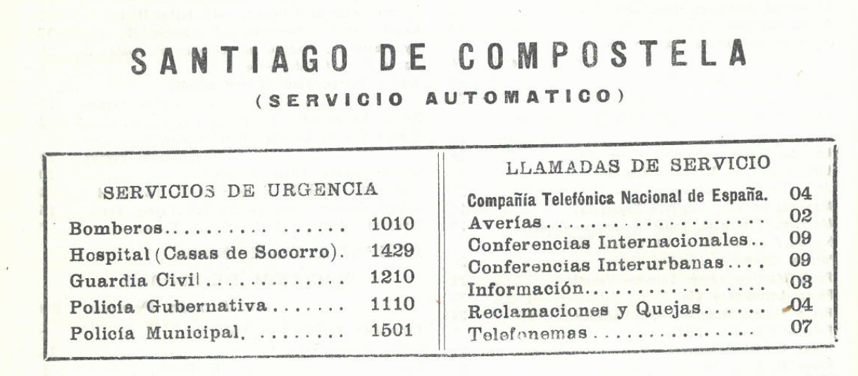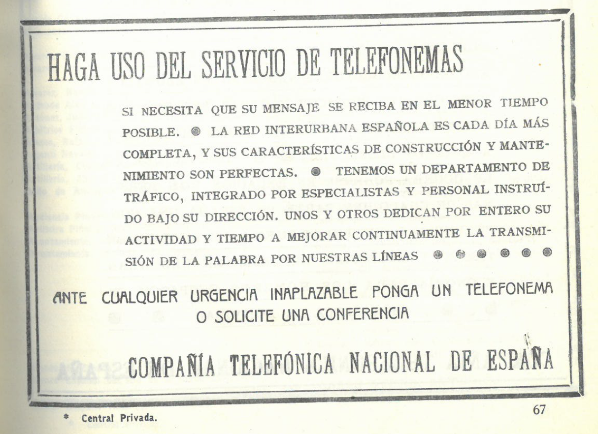 Ojeando las páginas alfabéticas, pronto observaremos que, de manera destacada, se inserta en cada población la dirección y teléfono de la «COMPAÑÍA TELEFÓNICA NACIONAL DE ESPAÑA». Esto es de gran utilidad para identificar el lugar preciso en el que se ubicaban las primeras centrales telefónicas de cada población. El número asignado era siempre sencillo y dependía de la cantidad de líneas: el 10, 20, 25, 30, 50, 100… En las áreas automatizadas era, sin embargo, siempre el mismo conjunto de numeraciones abreviadas y se anticipaba en la cabecera de la población.