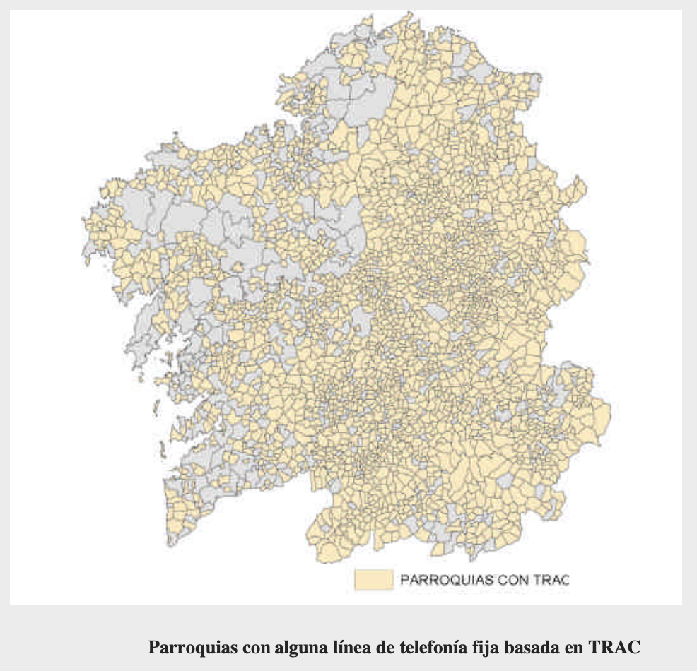 «La tecnología TRAC se adoptó como solución a la prestación del servicio de voz en zonas en las que el despliegue de red fija presentaba un alto grado de dificultad. La gran penetración del sistema TRAC en Galicia, que a finales del 2002 disponía de 78.427 líneas TRAC (un 33% de las líneas TRAC del país), refleja como las dificultades de despliegue de red fija de acceso son generalizadas en buena parte del territorio rural gallego, pero fundamentalmente en las provincias de Ourense y Lugo.«