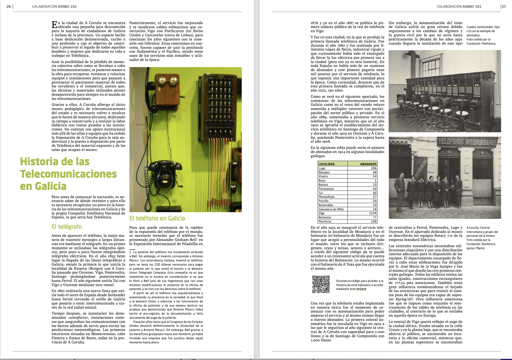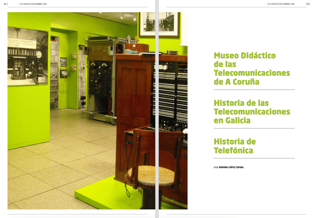 Se trata del último número de la revista de ASINEC, Asociación Provincial de Industriales, Electricistas y de Telecomunicaciones de A Coruña, que en su número 101, 2022, dedica un amplio reportaje, escrito por Román López Doval, no solo a la descripción del Museo y la entrevista de Felix Ródriguez Férnandez, uno de sus fundadores, si no además una síntesis de la historia de las telecomunicaciones y de Telefónica en Galicia. Son las páginas 24 a la 38 del citado número, que podéis leer o descargar desde esta dirección.
