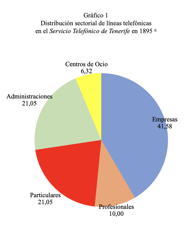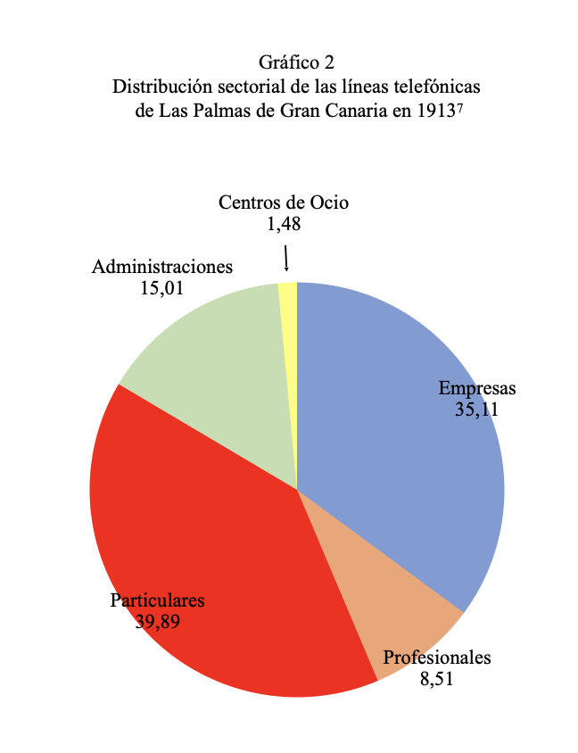 En lo que respecta a la tipología de los usuarios de estas primeras compañías, había un claro predominio de abonados correspondientes a comercios, hoteles y clientes institucionales frente a particulares (véase gráfico 1), si bien esta distribución se iría alterando poco a poco durante el tiempo de vida de las compañías haciendo que el porcentaje de usuarios estrictamente privados fuera creciendo Esto influiría después en las decisiones estratégicas de las zonas de expansión de las compañías, que siguieron más los intereses de estos grandes usuarios que los derivados de intentar popularizar el servicio accediendo a una mayor base demográfica. En cualquier caso, cada una de las redes urbanas contaba con unos 200 abonados al empezar el siglo XX. Si se realiza la misma prospección sobre la tipología de los abonados de la Red Telefónica de Las Palmas en ese momento se pueden observar algunas diferencias con la situación de la STT en 1895, como un mayor peso de los abonados particulares frente a los profesionales, comerciales o institucionales, algo que muestra como el uso de los sistemas telefónicos se fue popularizando más allá de ser una necesidad económica (véase gráfico 2).