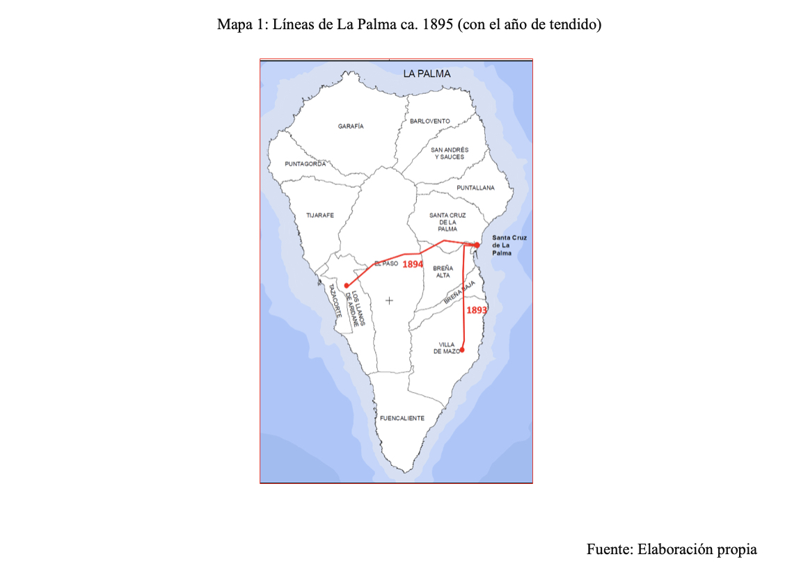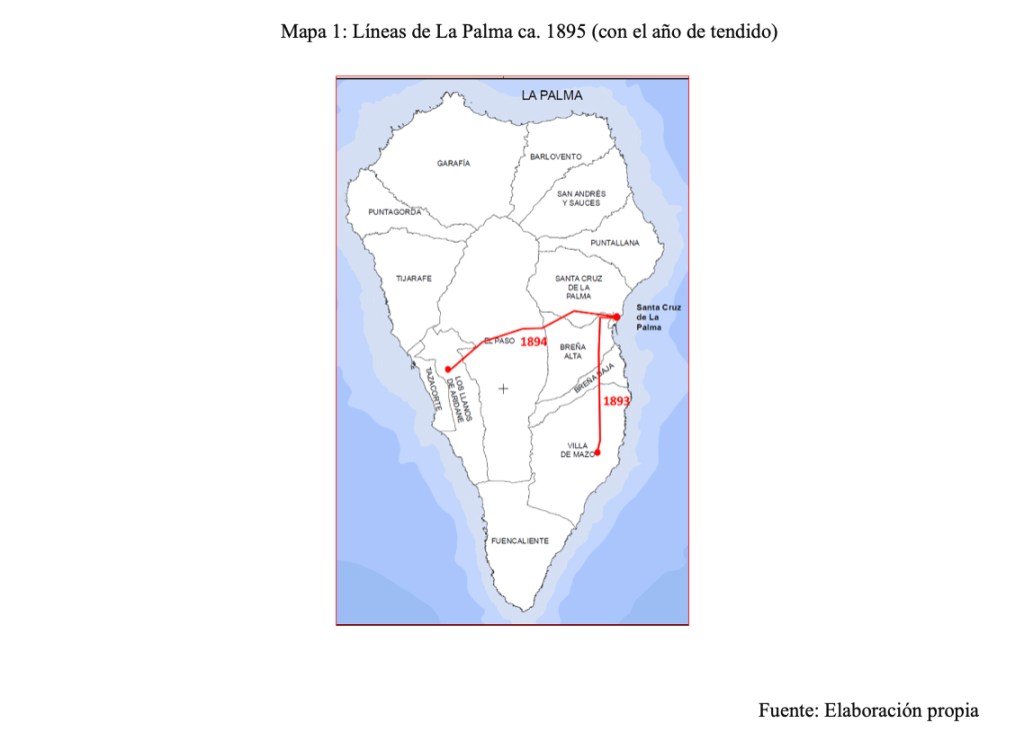 El otro gran núcleo de expansión telefónico lo supuso la isla de La Palma, que vivía en esa década final del siglo XIX un gran florecimiento económico. Allí el establecimiento de las primeras comunicaciones telefónicas se basó en líneas particulares que unían puntos cercanos vinculados al ámbito familiar y mercantil como casas y zonas de cultivo, y cuya referencia se ha perdido al no estar legalizadas en muchos casos. El empresario Rosendo Cutillas Hernández en 1893 fue el instigador de la instalación de las primeras líneas telefónicas de carácter comercial e interurbano, siendo significativo que el despliegue al interior de la isla del teléfono fue anterior al del telégrafo, que, aunque llegó a Santa Cruz de La Palma en 1883, no se extendió al interior hasta 1903. Esta línea tenía cerca de 10 km y unía Santa Cruz de La Palma con la Villa de Mazo, pasando por Breña Alta y fue seguida por otro que unía la capital insular con El Paso y Los Llanos de Aridane, línea que fue inaugurada el 17 de junio de 1894. Sin embargo, en la isla no se instaló una red conmutada sino una serie de líneas privadas que conectaban comercios o municipios con los puertos o la capital insular, por lo que la conectividad del servicio resultaba muy limitada.