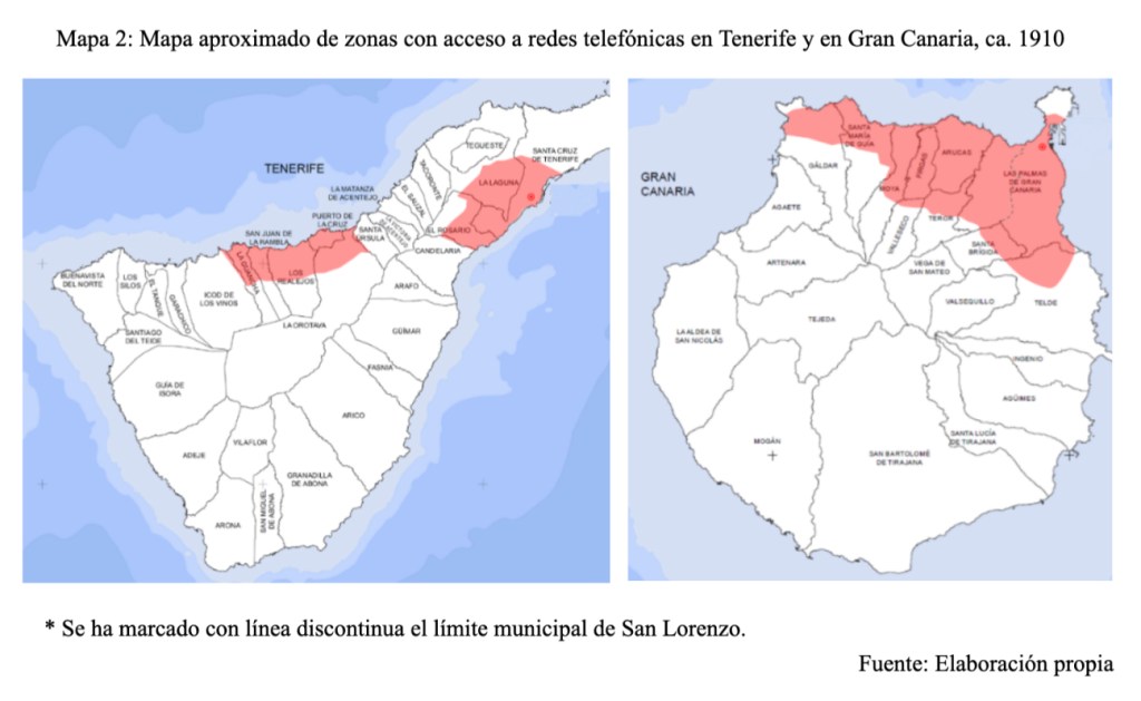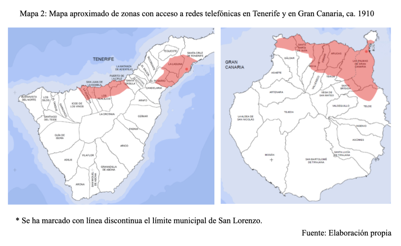 - Los cabildos fueron creados por la Ley de Cabildos del año 1912 promovida por Manuel Velázquez Cabrera y se constituyeron a partir de 1913, Para ver la diferencia de las políticas de ambos Cabildos respecto al crecimiento de las redes telefónicas insulares puede consultarse “El servicio de telefonía en Gran Canaria y Tenerife durante el periodo de entreguerras: modelos dispares en el camino hacia las redes insulares”. Accesible en https://accedacris.ulpgc.es/handle/10553/107472