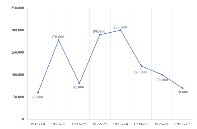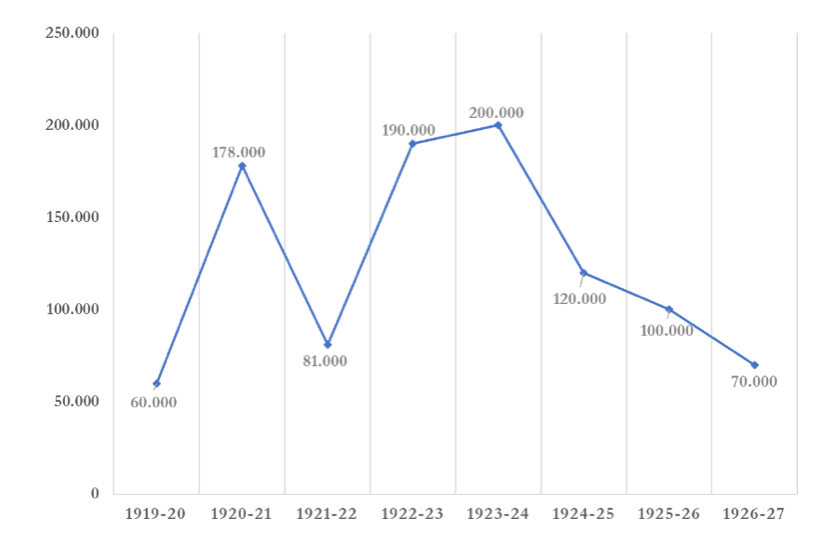 Las primeras líneas de la compañía entraron en funcionamiento en septiembre de 1921, nombrándose director de la red a Emilio López González. Si bien en su licencia original la RTIT figuraba únicamente como una red interurbana, la propia evolución del servicio, las demandas de los municipios y las carencias de la red de las operadoras urbanas de Santa Cruz y el valle de La Orotava fueron creando nodos con tipologías diferenciadas: en las ciudades cubiertas por las redes urbanas existentes (Santa Cruz, La Orotava, Puerto de la Cruz y La Laguna) se crearon centralitas para asegurar tanto el servicio interurbano como la conexión con los abonados de esas compañías. En las localidades de tamaño intermedio (municipios como Icod, Tacoronte, Güimar o Garachico), la demanda social obligó a establecer redes urbanas, que a su vez sirvieron como nodos de conexión a otros puntos de servicio telefónico en sus zonas de influencia11. Los mayores núcleos rurales fueron atendidos por subestaciones que operaban un número limitado de terminales (5-6 como máximo), en general en los edificios de las propias centrales, mientras que los pueblos menores o enclaves aislados tenían uno o dos terminales en locutorios, que desempeñarían un papel similar al de los teléfonos públicos de finales de siglo xx. Estos aparatos estaban situados en viviendas particulares, bares, establecimientos públicos o comerciales, y eran operados por personal ajeno a la compañía, que cobraba un porcentaje de la facturación, con una retribución mínima asegurada por parte de la RTIT12. La empresa concesionaria encargada de realizar los tendidos fue, en todos los casos, la AEG Ibérica de Electricidad, filial de la homónima alemana, y el ingeniero jefe delegado de esta compañía para supervisar los trabajos fue César Mansberger. Por su parte, los equipos terminales y de conmutación se adquirieron a la casa Ericsson. De este modo, se logró un servicio telefónico que para 1926 permeaba a casi todos los núcleos habitados de la isla (véase mapa 3), aunque de forma desigual en cuanto a su calidad. En él coexistían, además de las redes urbanas, centralitas y locutorios, las centrales que servían de puntos de enlace con las redes urbanas. Evidentemente, esto tuvo un gran coste, requiriendo inversiones que, sobre todo en los primeros años, llegaron a suponer un 10% de los ingresos del Cabildo, sobre todo en los ejercicios 1920-21 y 22-23 (véase gráfico 1).