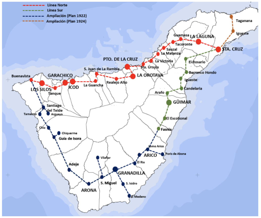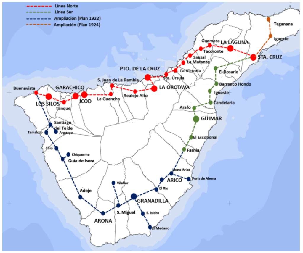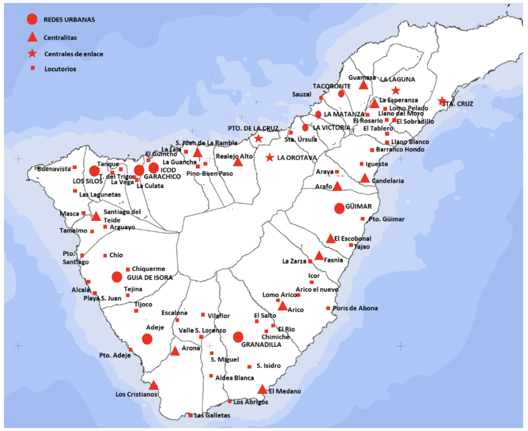 La red se estructuraba en dos líneas principales10: una primera sección comprendía la línea telefónica interurbana de Santa Cruz de Tenerife a La Orotava, incluyendo el tendido e instalación de un centro urbano en la región de Icod, con centralitas adicionales en Garachico y Los Silos, correspondiendo a esta obra la unión con la subcentral de La Orotava. El segundo grupo comprendía una línea interurbana desde la capital insular a Güimar y una red urbana en dicha población. Esta propuesta inicial se fue complementando a medida que se recibían nuevas peticiones, incluyendo algunas provenientes de zonas originalmente asignadas a las compañías urbanas: La Victoria, Santa Úrsula o La Matanza, que correspondían a la zona de la STO, o Taganana o Igueste en el caso de la STT, lo que obligaba a solicitar la autorización de las citadas concesionarias. En julio de 1922 se aprobó una ampliación de este plan inicial, ya con la idea de crear un anillo insular completo, que se muestra en detalle en el mapa 2.