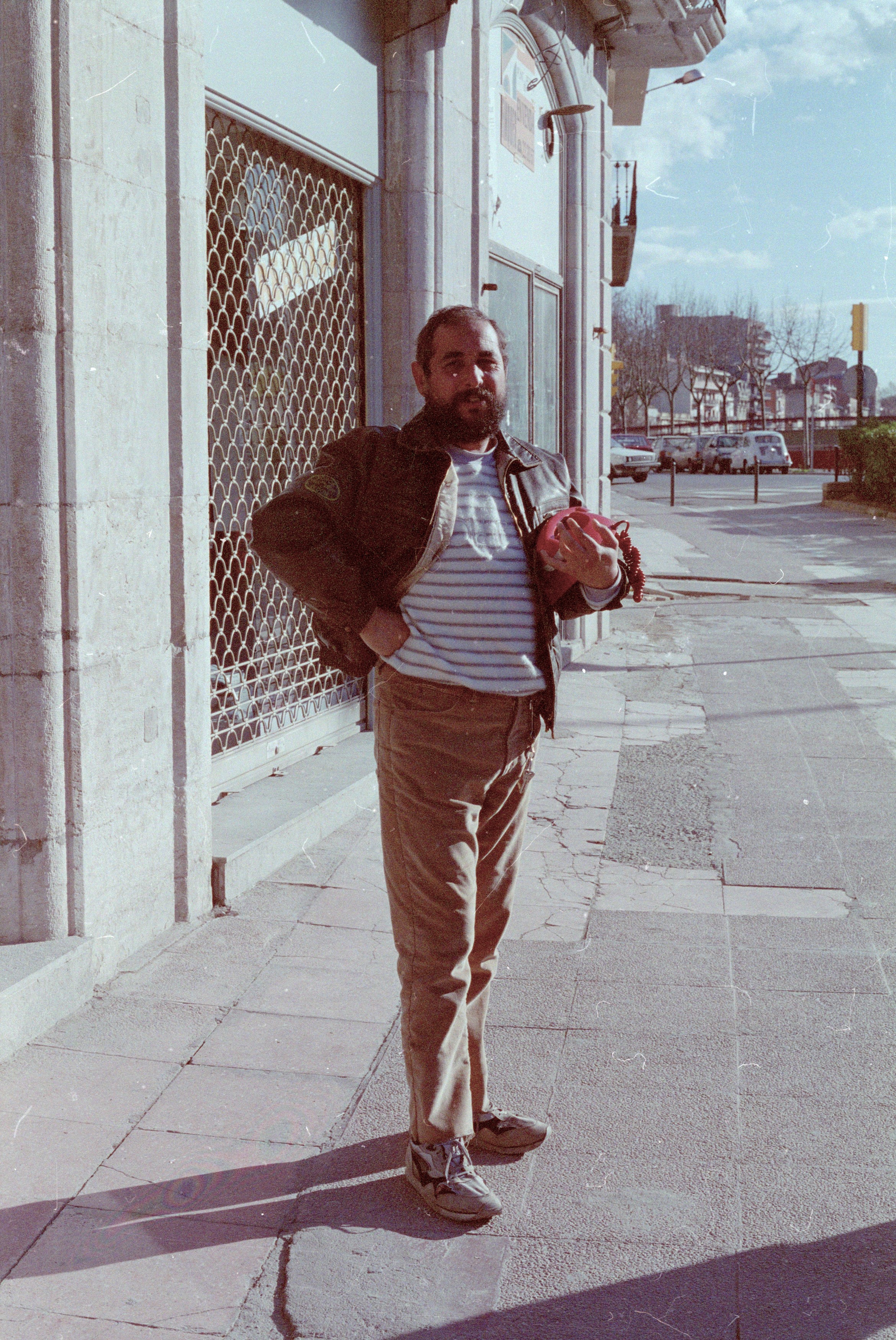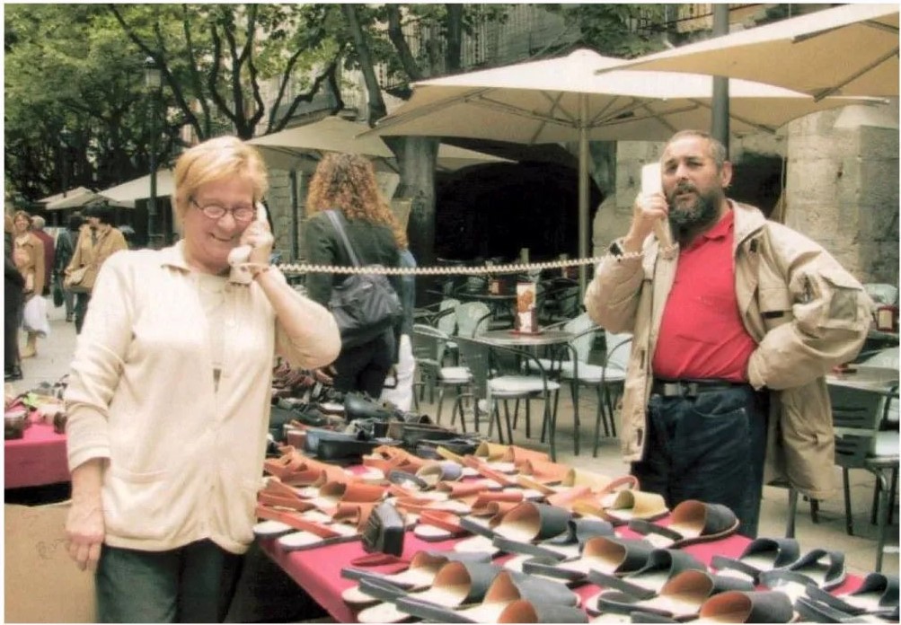 Esta persona es Josep Fernández, creo que vecino del barrio gerundense de Vista Alegre, y conocido como «el noi del telèfon». El pobre tiene o tenía (no sé si aún vive) una enfermedad mental y lo recuerdo, desde mediados de los setenta, paseando por Girona, sobre todo los domingos por la tarde por la Rambla, con un teléfono de disco en la mano, haciendo «ring, ring», descolgándolo, diciendo ¿diga? y comenzando una conversación imaginada. A veces, se te acercaba y te decía «es para tí» y te pasaba el auricular; lo hacías feliz si le seguías el juego. Con los años se pasó a un teléfono más moderno de Góndola. Curiosamente, cuando empezaron los móviles a proliferar por las calles (principios del 2000) dejó de pasear con el teléfono. Entonces ya no era el único «loco» que iba hablando solo por las calles pegado a un teléfono… Unos dicen que dejó de hacerlo a causa de una paliza que le dieron unos desgraciados para mofarse de él… La cuestión es que, de alguna forma, «El noi del telèfon» es el precursor del teléfono móvil en Gerona y parte del extranjero, al menos, fue el primero por pasar por las calles «hablando solo» con la ayuda de un teléfono.