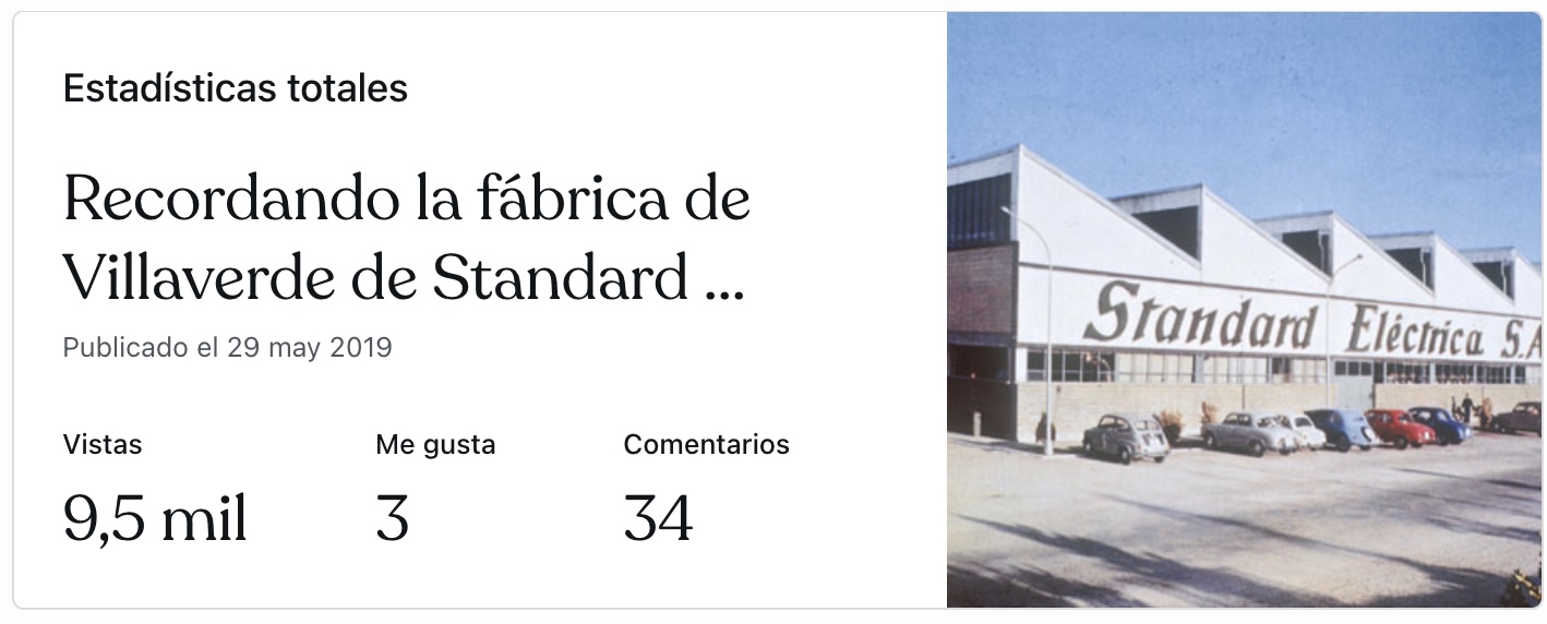 Muy de cerca y subiendo tenemos en octava posición Recordando la fábrica de Villaverde de Standard Eléctrica que suma continuamente las visitas y comentarios de los veteranos de esta empresa que fue modelo del sector y que sin duda merece un recuerdo mayor de que conserva.