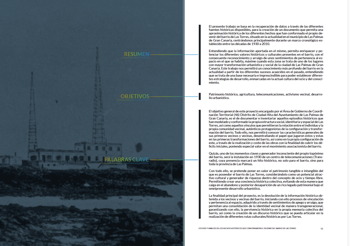 El estudio desarrolla el repaso a la larga historia del paraje, los altos de Guanarteme, en donde ahora se asienta el barrio de «Las Torres». Nosotros destacamos los capítulos dedicados a «Transradio» y «Radiografía de la construcción de una torre», páginas 37 y 49 respectivamente, en los que se aportan interesantes datos relacionados con la historia de las telecomunicaciones.