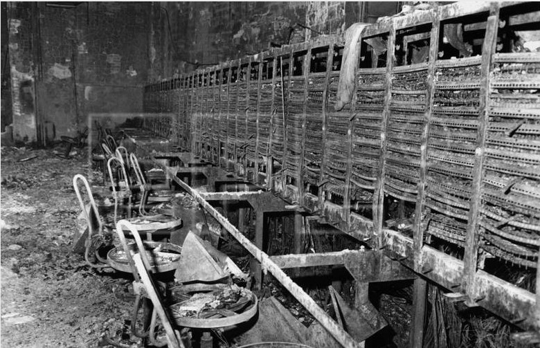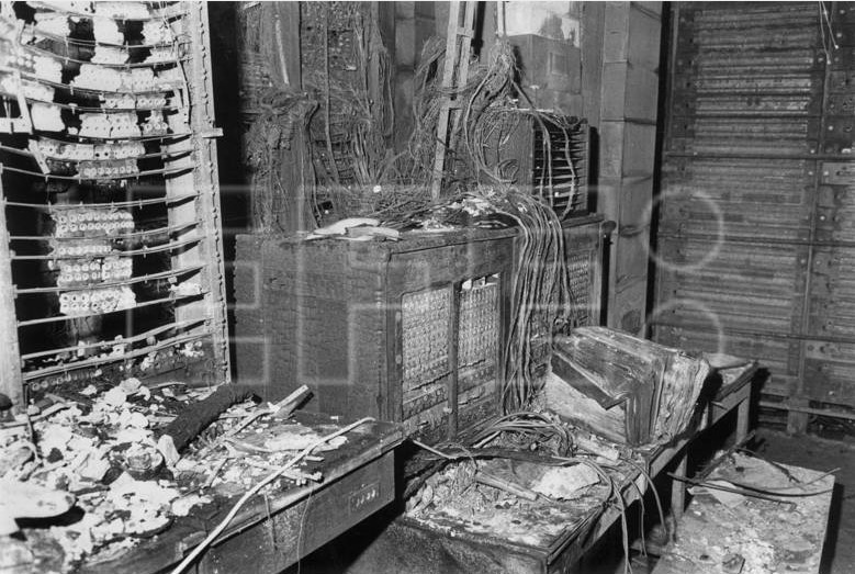 – Sexta, séptima y octava planta del edificio totalmente destruidas. Como hemos comentado anteriormente, en la sexta planta estaban el repartidor interurbano y sus mesas de pruebas, la séptima estaba ocupada por el departamento de Tráfico, es decir todas las operadoras que atendían los servicios manuales y en la octava planta se situaba las salas de descanso y vestidores de las operadoras.