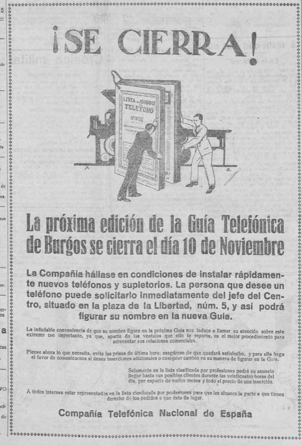 La central telefónica urbana de Burgos se encontraba en el número 5 de la Plaza de la Libertad, e inicialmente el listado de los abonados estaba en la propia central, siendo las telefonistas las que informaban de los teléfonos solicitados a los vecinos interesados en establecer una conferencia.