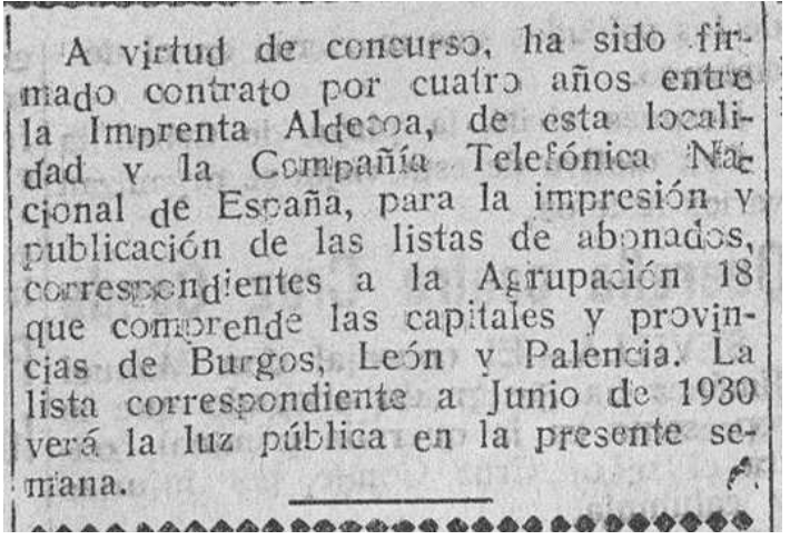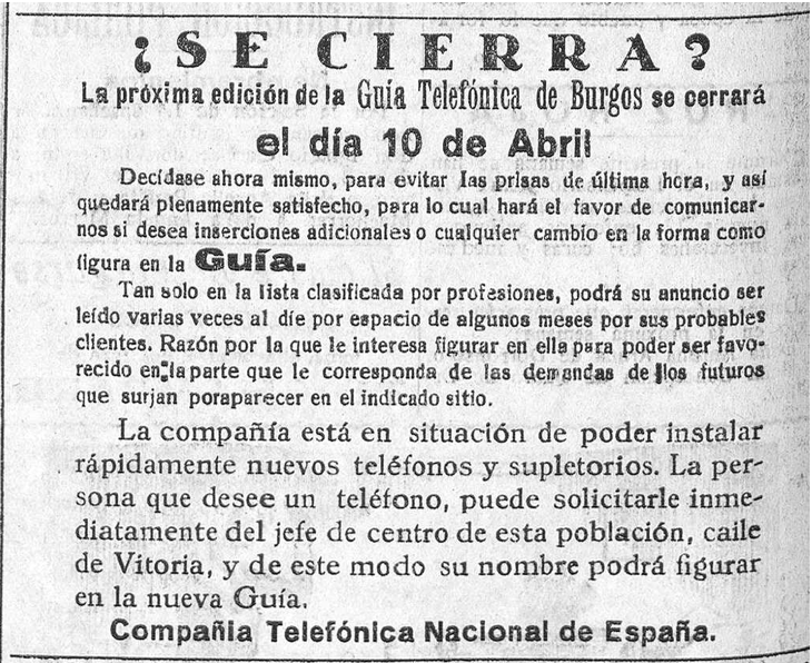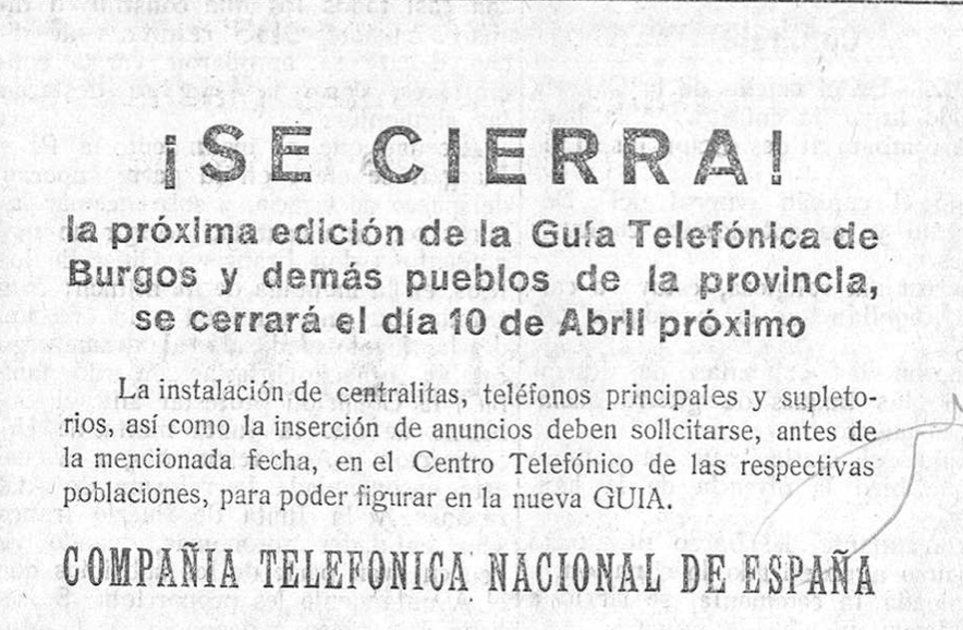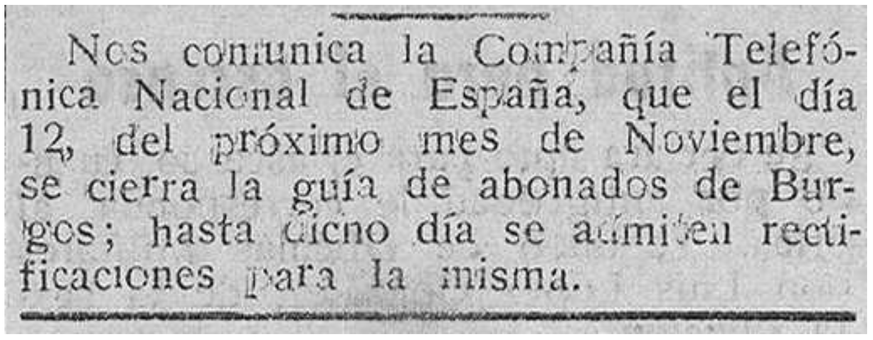 Siguiendo las notas, anuncios y artículos que hemos encontrado en la hemeroteca y en la red, esbozamos la siguiente secuencia de hechos que, en un primer paso, como cuando ponemos las primeras piezas de un puzzle, nos dibujaran la senda -de la historia de las guías telefónicas en Burgos- que podremos ir completando en futuros pasos.
