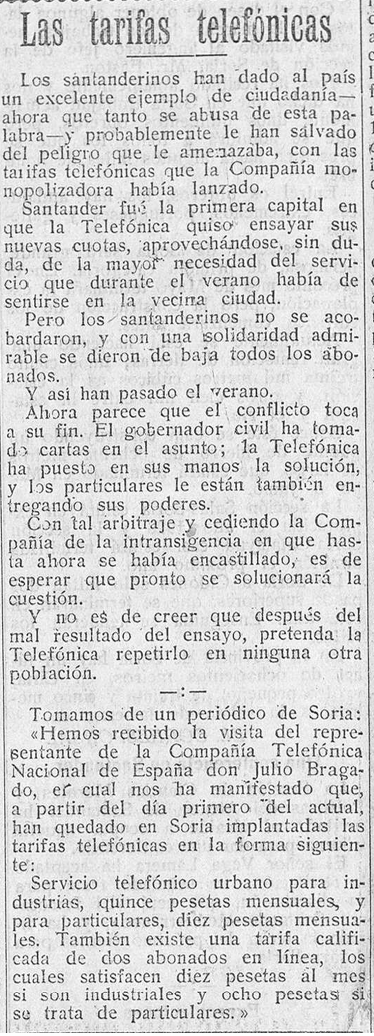 Una de las primeras consecuencias de la llegada de la nueva empresa fue la modificación, al alza, de las tarifas. En la prensa de Burgos se hacían eco del plante propuesto por los abonados de Santander en noviembre de 1927, por la subida de tarifas, lo que promovió la baja masiva de abonados al servicio.