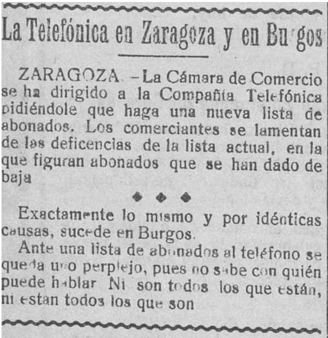 Nuestra querida colaboradora burgalesa Gloria Sanllorente, historiadora y cronista de la historia de la telefonía en Burgos, recientemente fallecida, realizó un serio trabajo de investigación, buscando con ahínco en las hemerotecas y archivos cualquier detalle que nos informase de los hechos y circunstancias acaecidos en relación con la llegada y el desarrollo de la telefonía en la citada ciudad castellana y su provincia. Entre las muchas cosas que se quedaron en su tintero y a modo de pequeño homenaje, entresacamos, en esta entrega, algunas curiosidades sobre las primeras guías y directorios telefónicos (tema que tratamos con frecuencia) que por allí circularon y los acontecimientos telefónicos reflejados en la prensa.