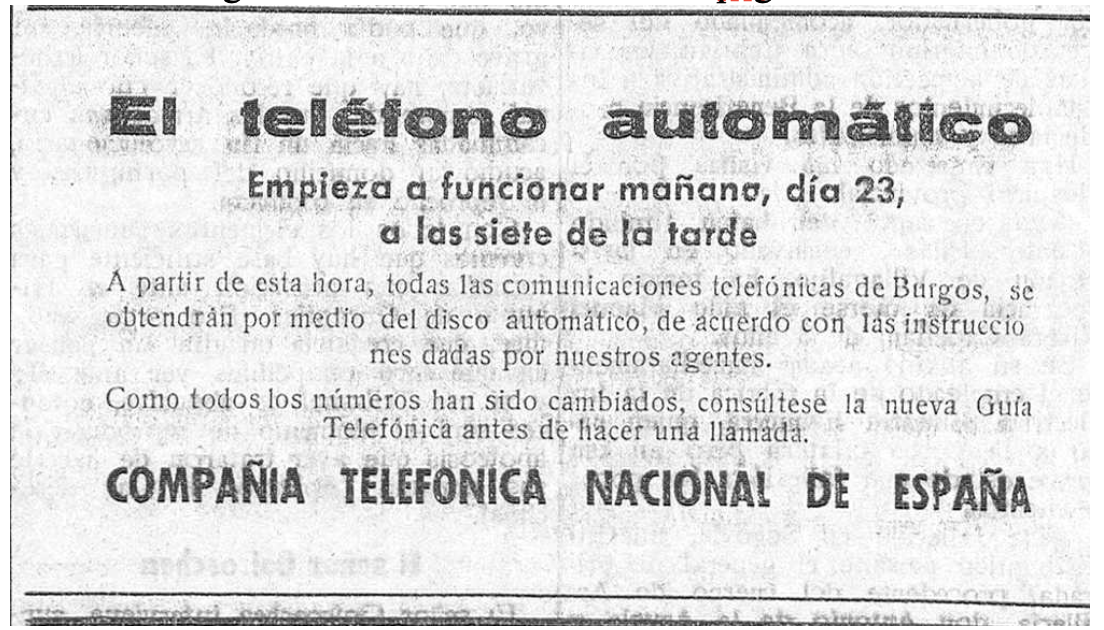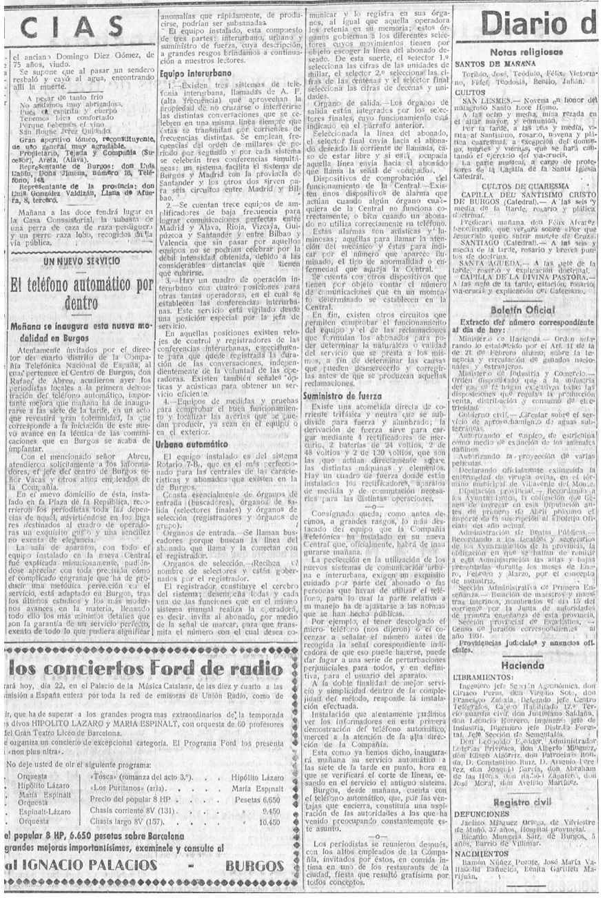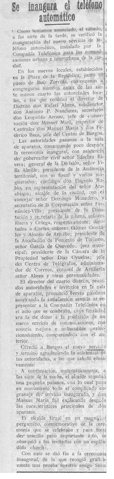 Gracias a la nota de prensa del Diario de Burgos de 26 de febrero de 1935, en la que se anuncia la necesaria edición de un nuevo suplemento, tenemos el dato de la fecha de inauguración de la primera central automática en Burgos el 23 de marzo de 1935 a las 19 horas.