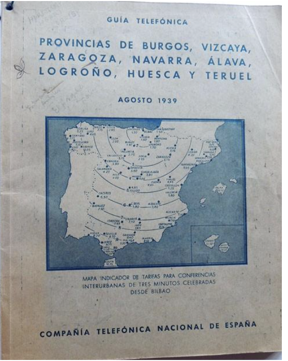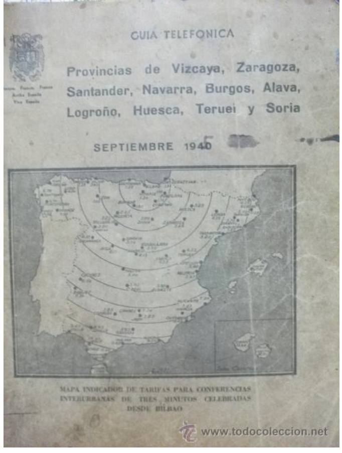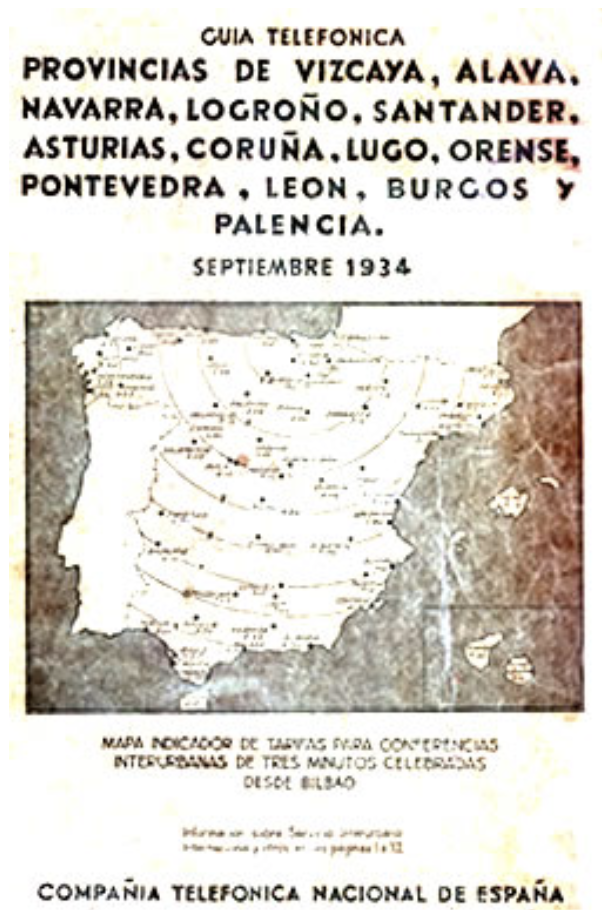 Con fecha de edición septiembre de 1934, encontramos la portada de la guía multiprovincial que cubría los abonados de todas las provincias del norte peninsular: Galicia, Asturias, Cantabria, País Vasco, Navarra, La Rioja, y León, Burgos y Palencia, ilustrada con el mapa indicador de tarifas para conferencias interurbanas de tres minutos celebradas desde Bilbao.