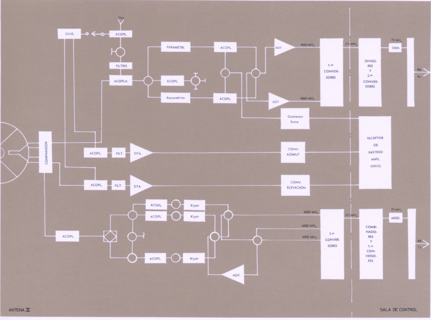• Un diplexor (reuse diplexer) cuya misión era combinar las señales de transmisión y recepción en el mismo alimentador. En el “Feed Flange” la señal transmitida podía tener una potencia máxima de 64,7 dBm (3 Kw) mientras que la potencia de señal recibida del satélite en el mismo punto estaba en torno a -110 dBm. El aislamiento entre la Transmisión (Tx) y la Recepción (Rx), debía de ser muy alto para que las señales de Tx no saturasen los LNA de la Rx