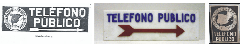 Y los otros, serian estos tres rótulos “TELÉFONO PÚBLICO”. Pero unos…, porque serán casi imposible conseguirlos: el de “TELÉFONO PÚBLICO” esmaltado con flecha indicativa de dirección, no he visto nunca ninguno físicamente… solo en la Revista Telefónica Española de 1926. El otro, en de material en plástico o metacrilato, solo lo he visto en el Archivo Fotográfico de la CTNE. Y por último, el del cartel de bronce “TELÉFONO PÚBLICO” sí está a la venta, pero su elevado coste económico, de momento… me impide comprarlo. Me tendré que conformar con verlos en fotografías en espera, que la diosa fortuna se vuelva a cruzar de nuevo en mi camino… y quién sabe si en la próxima revisión del artículo, alguno de ellos, pudieran estar ya en mi colección…