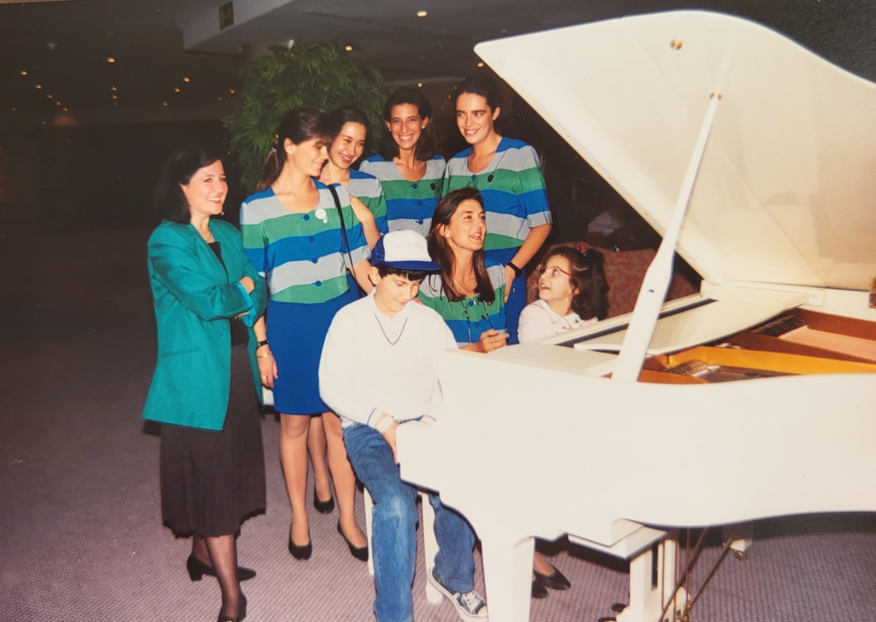 En la Expo92 de Sevilla. Izda.: Al pabellón de Telefónica. Dcha.: En el piano Esperanza Fernández Mayoralas y las azafatas.