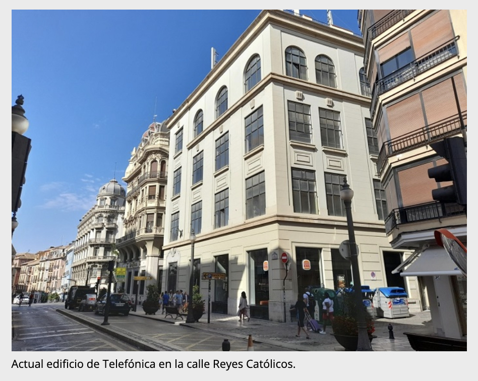Llegó 1925. Compañía Telefónica Nacional de España buscó un lugar céntrico de Granada donde ubicar la principal central. Encontró un edificio de viviendas a tiro de piedra de la casa de Correos y Telégrafos de Reyes Católicos, 46 (actual plaza Isabel la Católica). El solar número 55 de esa misma calle, con fachada trasera a lo que quedaba del Zacatín, y otras fachadas laterales a Abenamar y Joaquín Costa.