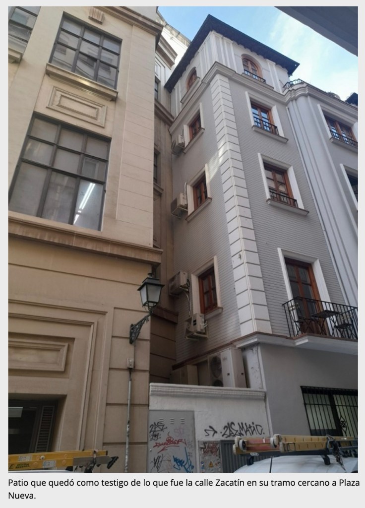 Al solar del edificio original se le permitió por parte del Ayuntamiento incorporar por su parte trasera el tramo ciego de calle Zacatín que había quedado cortada al construir la Gran Vía, desde 1905. Se puede apreciar todavía una especie de patio interior en la fachada que da a la calle Joaquín Costa. La calle Zacatín continuaba muy estrecha hasta desembocar en Plaza Nueva, al lado de calle Hermosa.