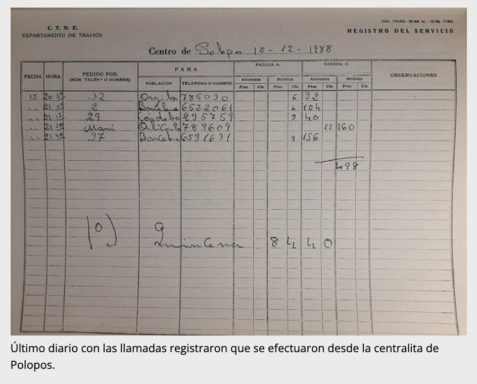1988. Aquel año fueron sustituidas las últimas estaciones manuales de la provincia, en número de 21, y se automatizó todo el servicio de telefonía. Polopos fue la última centralita en desaparecer de toda España, en diciembre de aquel año. La última conexión manual de la última operadora de Telefónica, Magdalena Martín López, fue conectar mediante clavijas los teléfonos números 37 de Polopos con el 6531631 de Barcelona (Eran las 21,40 del 15 de diciembre de 1988; la Mari alpujarreña y la Marijose de Cataluña fueron las últimas en hablar por este sistema). Al día siguiente, el 16 de diciembre, Magdalena Martín López, conectó, en la despedida protocolaria, desde la centralita de Polopos con el presidente del Gobierno, Felipe González, en presencia del ministro de Transportes y Comunicaciones, José Barrionuevo, y del presidente de Telefónica, Luis Solana.