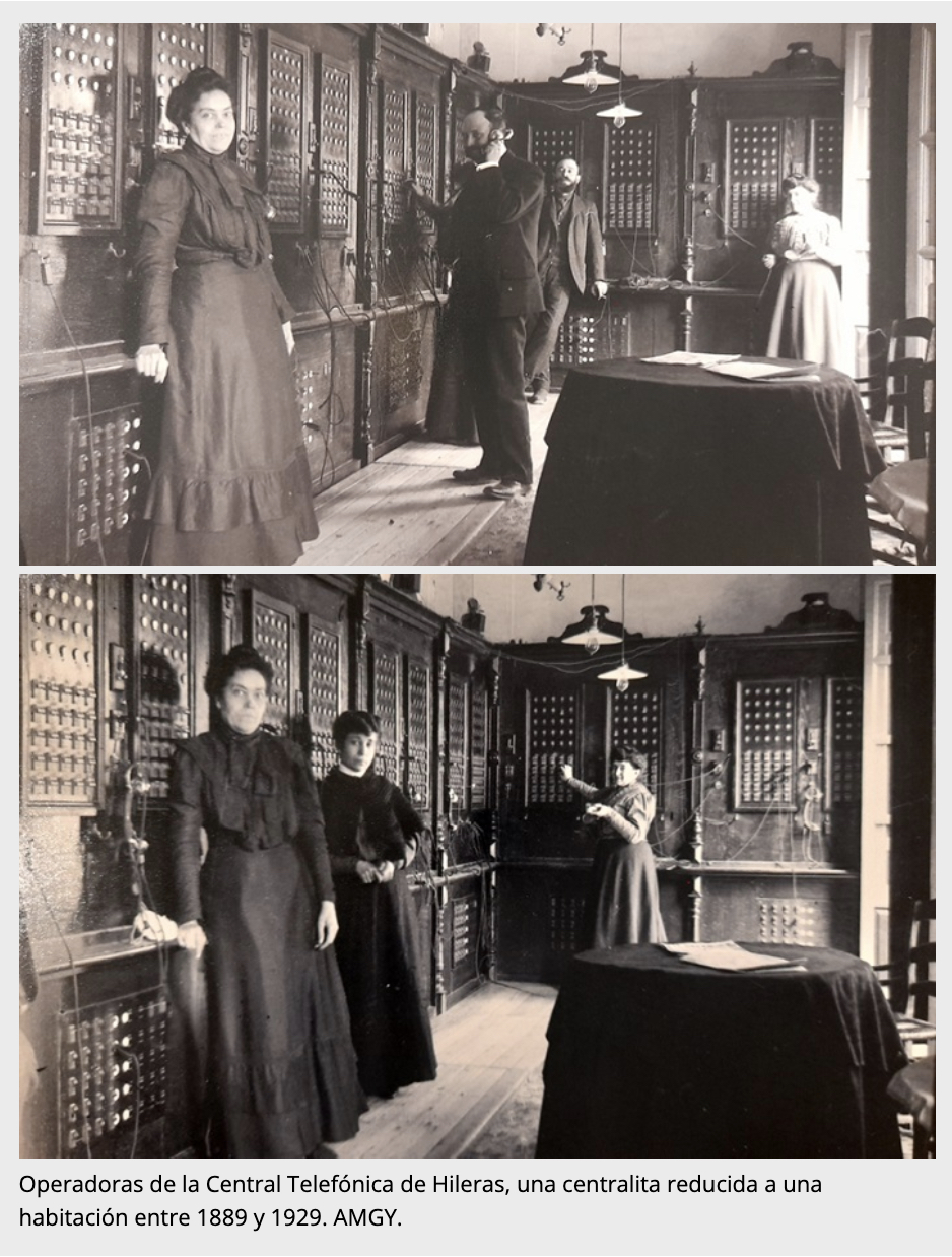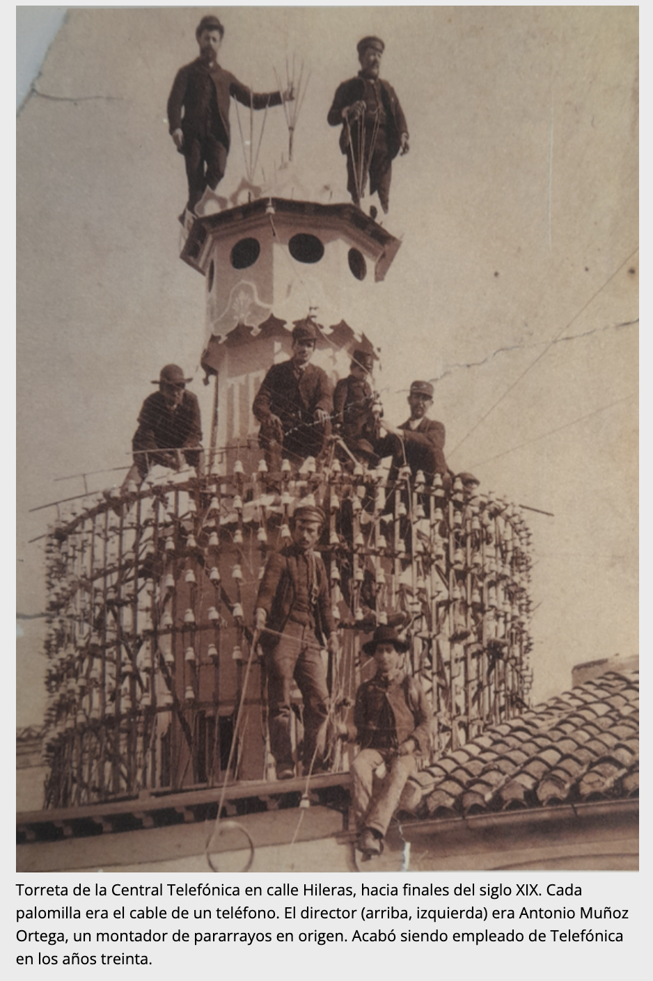 La historia de las comunicaciones telefónicas surgió muy pronto en Granada capital. Graham Bell inventó un sistema para comunicarse a distancia mediante un hilo de cobre en 1876. En julio de 1889, sólo doce años más tarde, fueron seis granadinos los que se asociaron para crear la Central Telefónica de la Calle Hileras. Los promotores fueron la Viuda de Godoy, Francisco Rodríguez, Diego Godoy, Luis Rico, José Paz y Nicolás Castillo1. El primer director fue Antonio Muñoz. Montaron la sede en la casa de uno de ellos, en la calle Hileras, 1. Construyeron un castillete sobre el tejado desde el que tendieron infinidad de cables que comunicaban con cada una de las casas de los primeros abonados. Además del personal de instalación, contaron con una plantilla de 14 telefonistas (6 numerarias y 8 supernumerarias)2. Su misión consistía en enchufar y desenchufar las clavijas para poner en contacto a los clientes.